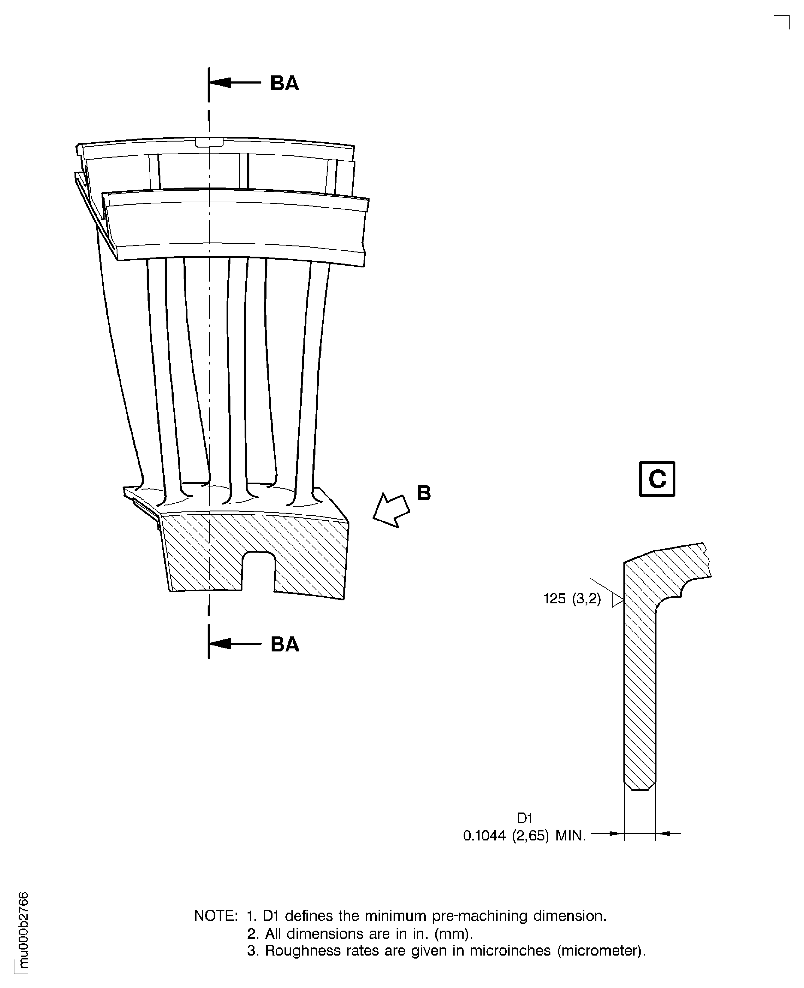 Figure: Inner buttress front flange plasma spray repair (finish dimensions) of the stage 3 turbine vane