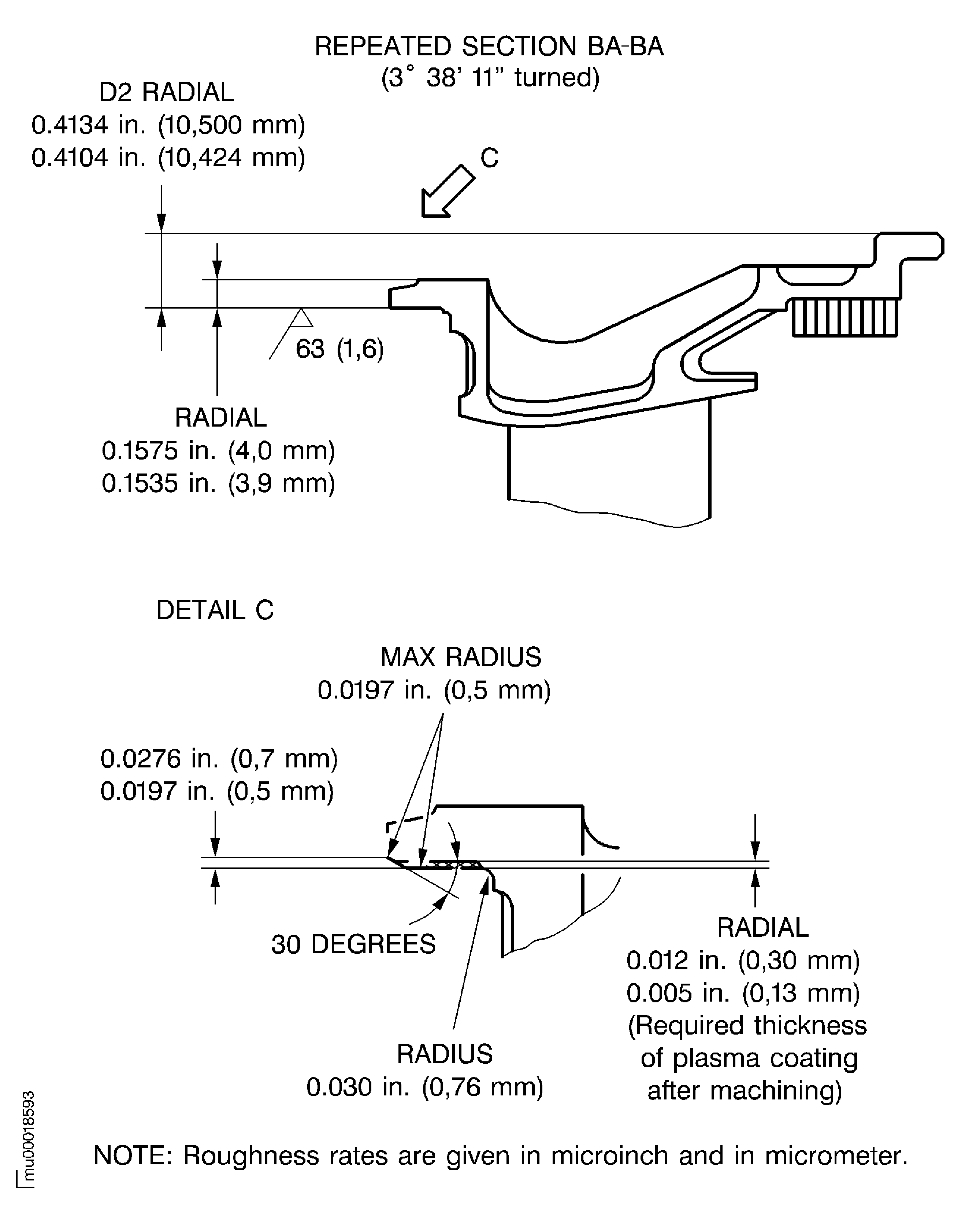 If the outer buttress platform front lips were plasma spray repaired before, remove the old coating fully.