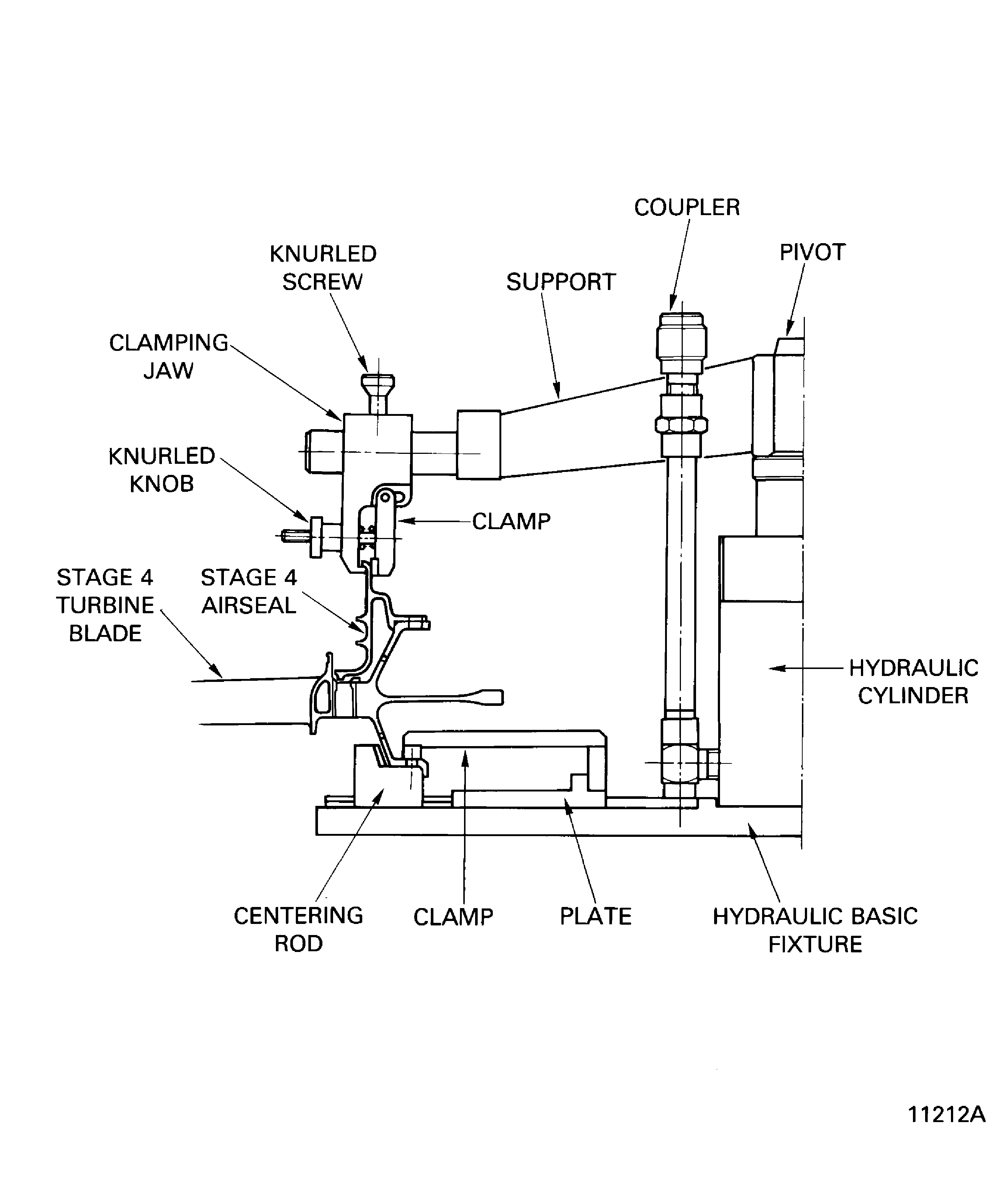 Open the hydraulic valve at the IAE 1M14148 Hydraulic basic fixture 1 off. Lower the support with the stage 4 air seal carefully until the air seal is in contact with the stage 4 disk.