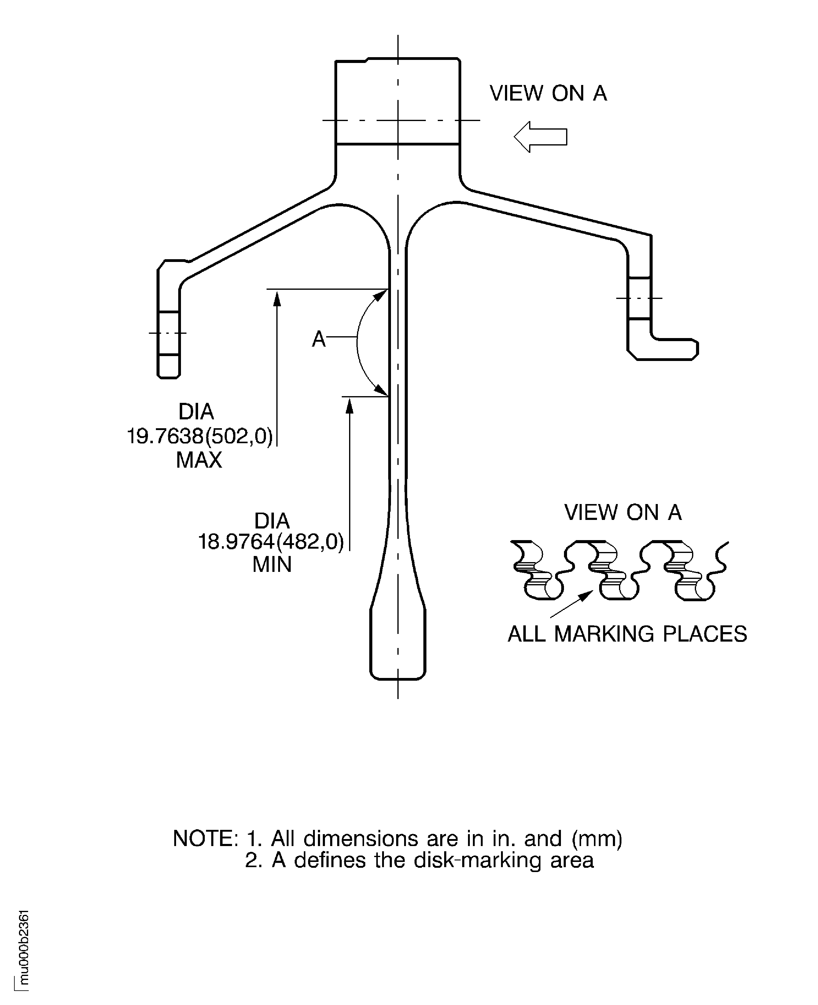 Make sure that you use the correct locating ring of the IAE 1M14153 Assy/disassy stand 1 off for the stage 5 disk.Identify the disk slot with the disk serial number. The serial number is vibrograved on the rear face of the disk. The groove number one is the first groove on the right side of the serial number. Make a mark to the groove number one at the front side. Use CoMat 02-129 MARKER.