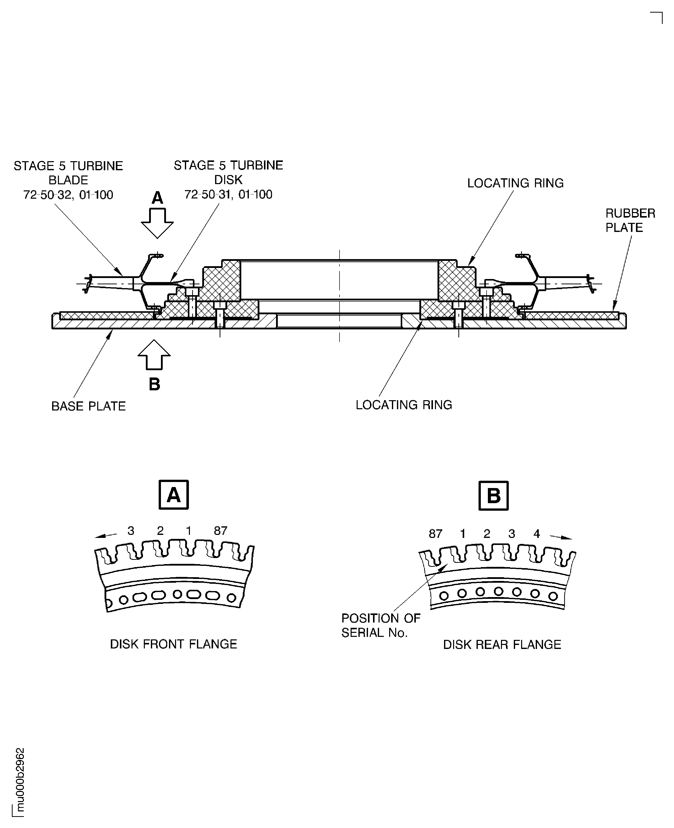The turbine blade identification number is the same as the blade identification number at the blade distribution protocol.Put the stage 5 turbine disk on the IAE 1M14153 Assy/disassy stand 1 off, turbine disk front flange upwards.