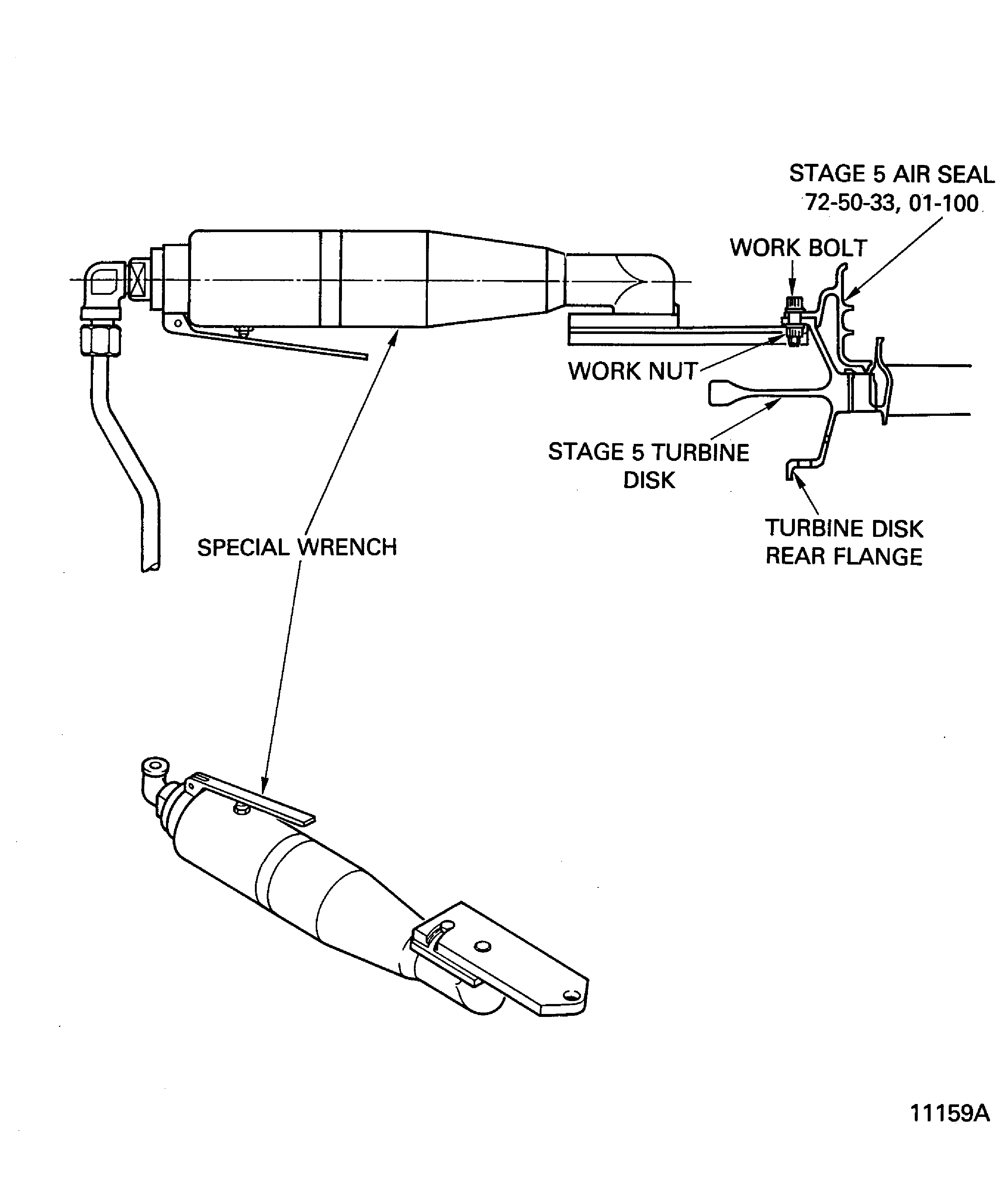 HOLD THE BOLTS IN THEIR POSITION WHEN YOU INSTALL THE NUTS ON TO THE BOLTS. DO NOT TURN THE BOLTS OR MAKE TO-AND-FROM MOVEMENTS. THE DISK/INNER AIR SEAL FLANGES AND/OR THE BOLTS CAN BE DAMAGED BY SCORES.Install the six work bolts and work nuts to safety the airseal on the disk. Tighten the nuts.