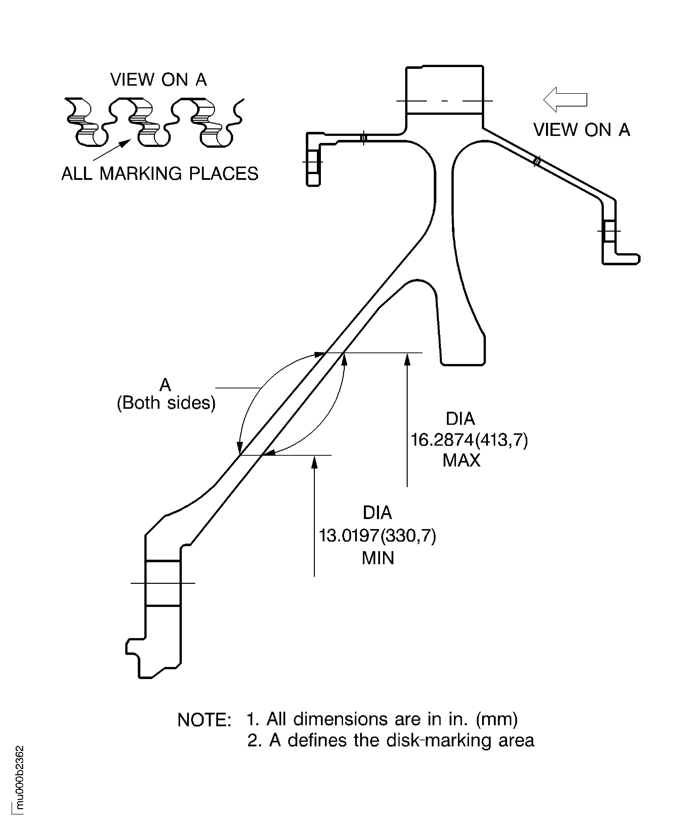 Make sure that you use the correct locating ring of the IAE 1M14153 Assy/disassy stand 1 off for the stage 6 disk.Identify the disk slot with the disk serial number. The serial number is vibro-engraved on the rear face of the disk. The groove number one is the first groove on the right side of the serial number. Make a mark to the groove number one at the front side. Use CoMat 02-129 MARKER.