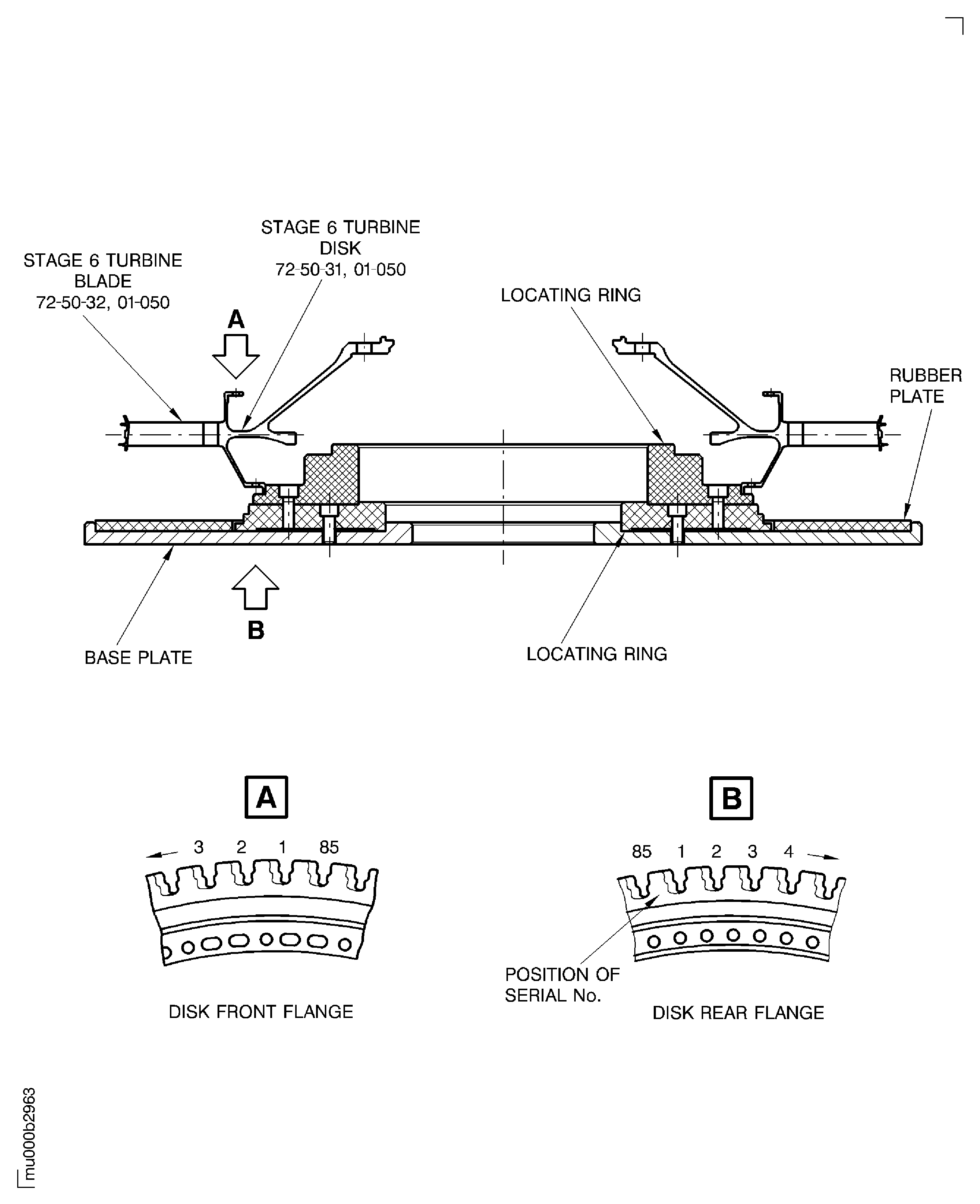 The turbine blade identification number is the same as the blade identification number at the blade distribution protocol.Put the stage 6 turbine disk on the IAE 1M14153 Assy/disassy stand 1 off, turbine disk front flange upwards.