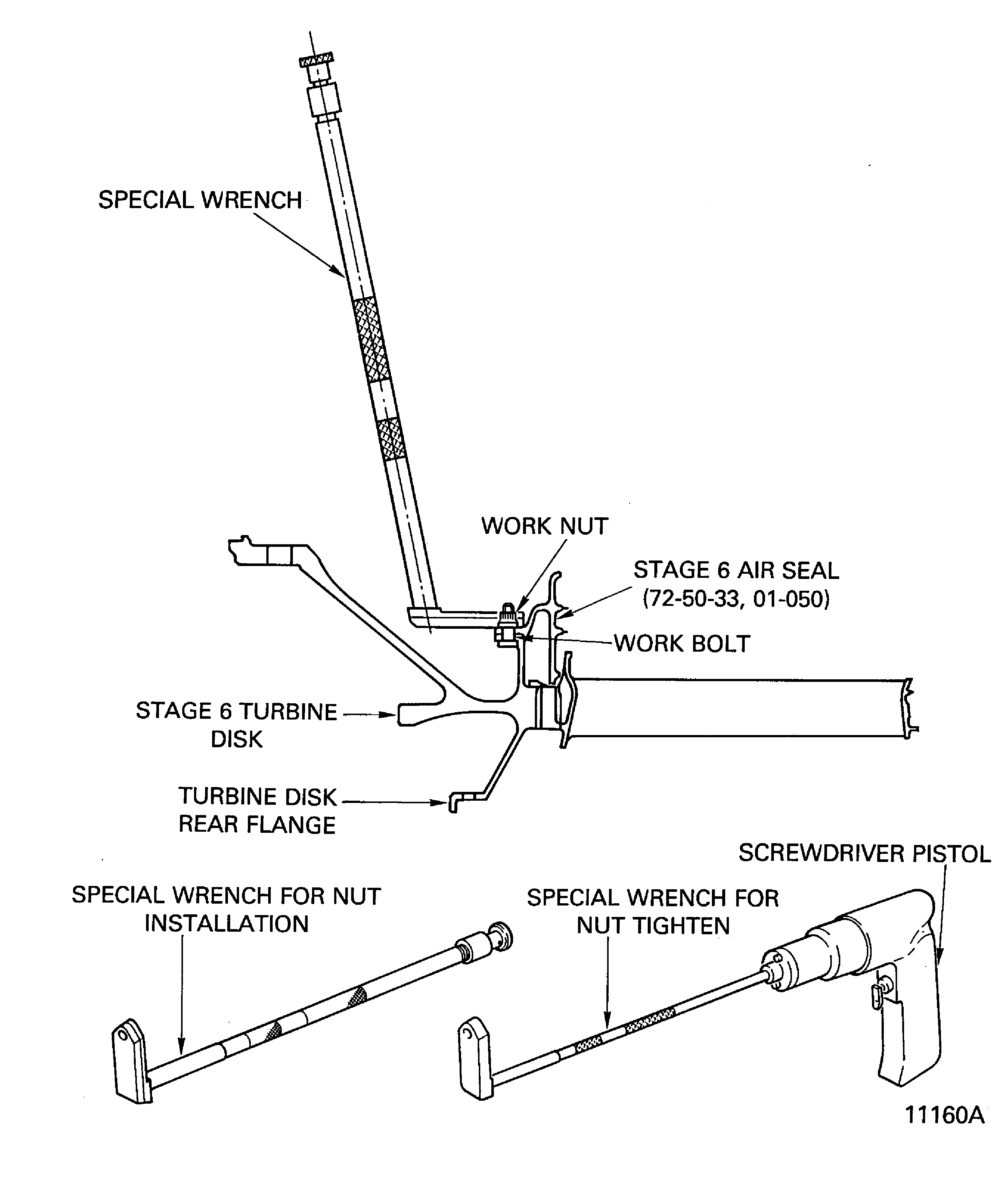 HOLD THE BOLTS IN THEIR POSITION WHEN YOU INSTALL THE NUTS ON TO THE BOLTS. DO NOT TURN THE BOLTS OR MAKE TO-AND-FROM MOVEMENTS. THE DISK/INNER AIR SEAL FLANGES AND/OR THE BOLTS CAN BE DAMAGED BY SCORES.Install six work bolts and work nuts to attach the air seal on the disk. Tighten the nuts.