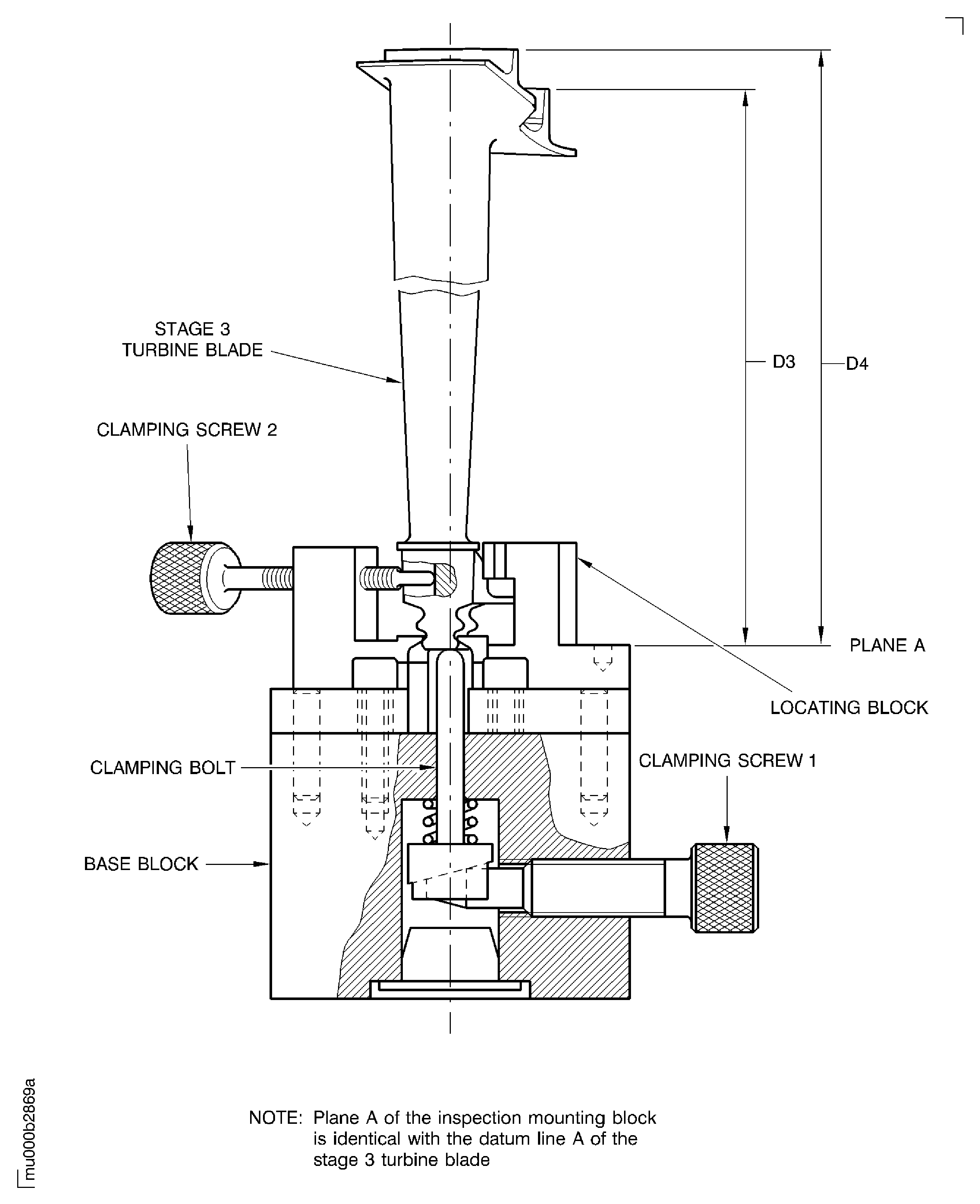Install the stage 3 turbine blade with the rear knife edge seal located to the front of the IAE 2M14195 Inspection mounting block. The blade root nose must touch the locating block.