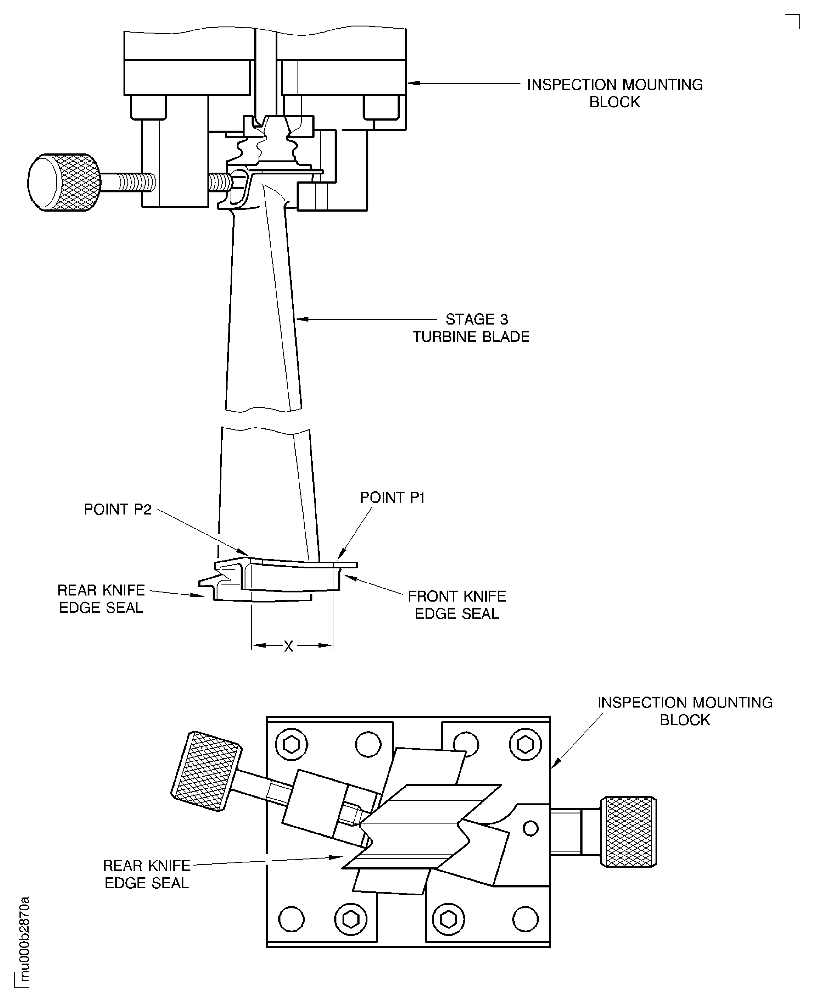 Turn by 90 degrees the IAE 2M14195 Inspection mounting block to bring the stage 3 turbine blade in the horizontal position. The rear knife edge seal of the stage 3 turbine blade must be down.