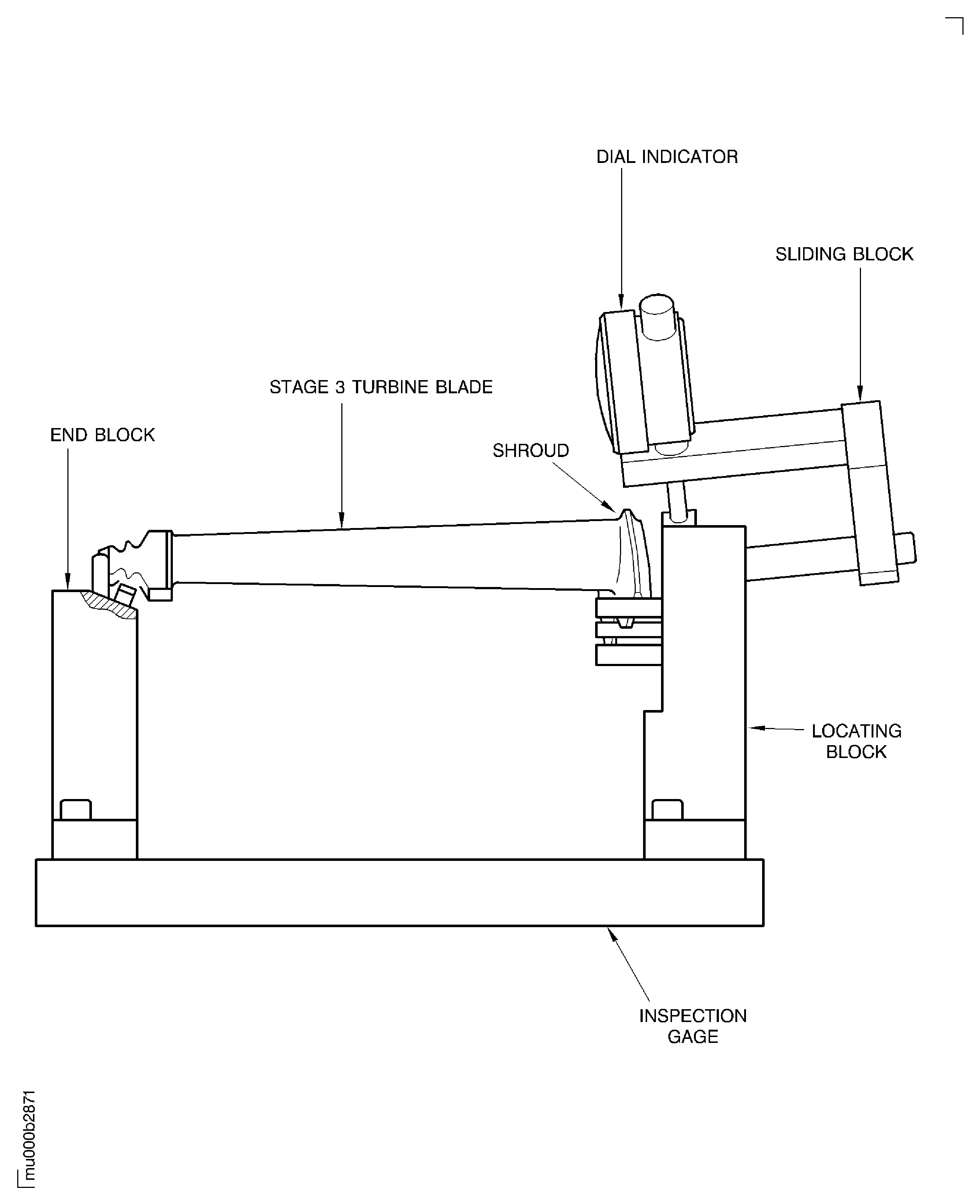 Install the stage 3 turbine blade with the convex side down on to the IAE 2M14188 Inspection gage 1 off. Make sure that the stage 3 turbine blade is correctly installed in the IAE 2M14188 Inspection gage.