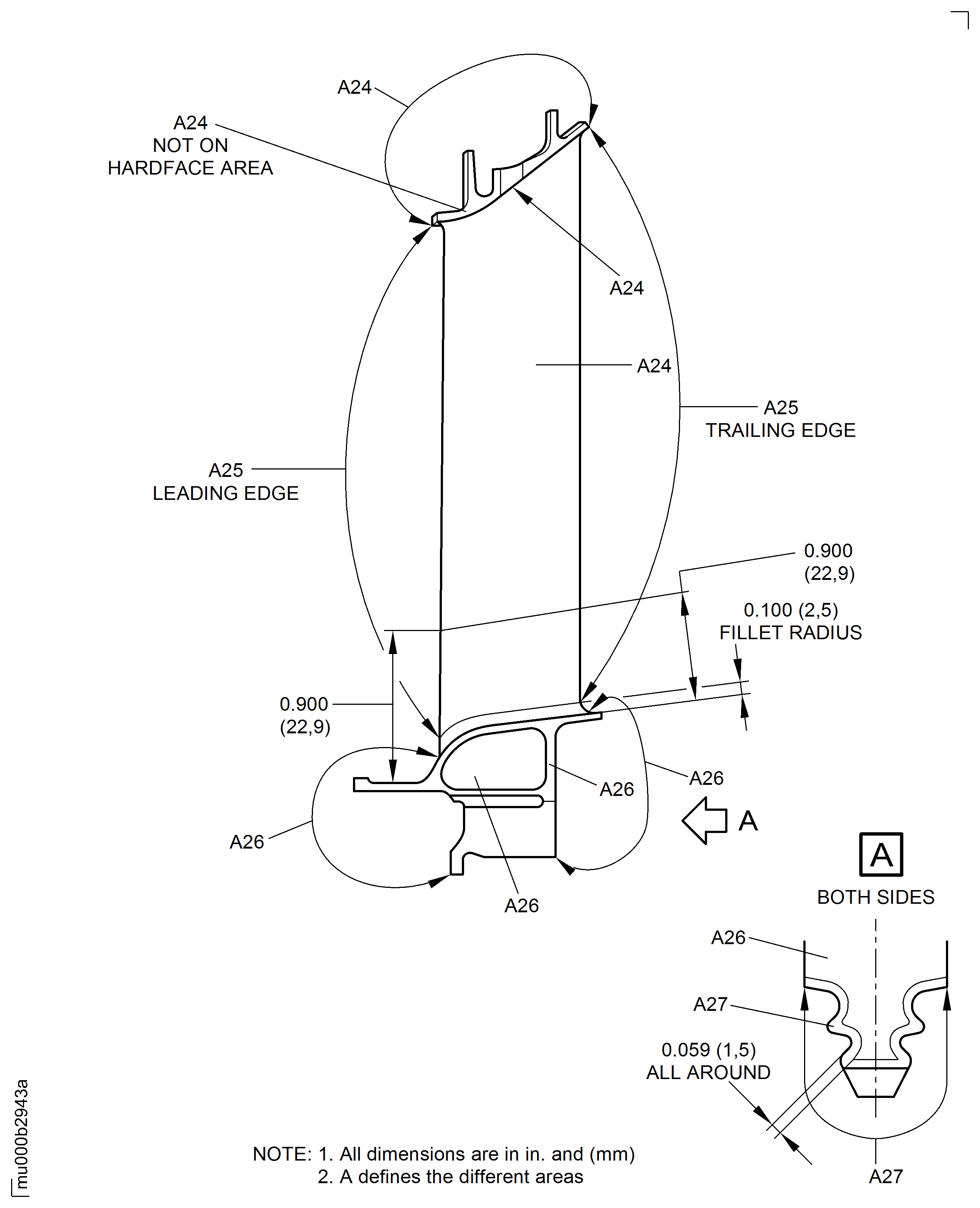 This examination includes surface defects which are permitted per production standard. Surface defects are not caused by hit of some objects or service operation.Fluorescent penetrant examine or visually examine areas A1 to A7 for surface defects. Refer to the SPM TASK 70-23-08-230-501 or SPM TASK 70-21-01-220-501.Surface defects larger than 0.015 in. (0.38 mm) diameter must have a bottom which can be seen.Surface defects not larger than 0.015 in. (0.38 mm) can be non bottomed.A cluster is a defect of four or more surface defects, clearly apart, which can be contained within a 0.200 in. (5.08 mm) diameter circle. In the cluster all surface defects must be 0.015 in. (0.38 mm) or less.If not differently specified, surface defects of 0.015 in. (0.38 mm) or less must be ignored if they are not found in linear alignment or clusters, or in areas where 0.015 in. (0.38 mm) is the maximum permitted size.In areas where 0.015 in. (0.38 mm) is the maximum permitted size, surface defects 0.010 in. (0.25 mm) or less, not in linear alignment or clusters must be ignored.If permitted limits on coated surfaces are exceeded, remove the coating and make a estimate of the surface defects again. Repair coating per VRS4298 TASK 72-50-32-300-047 (REPAIR-047) or VRS4300 TASK 72-50-32-300-049 (REPAIR-049).More than in Step