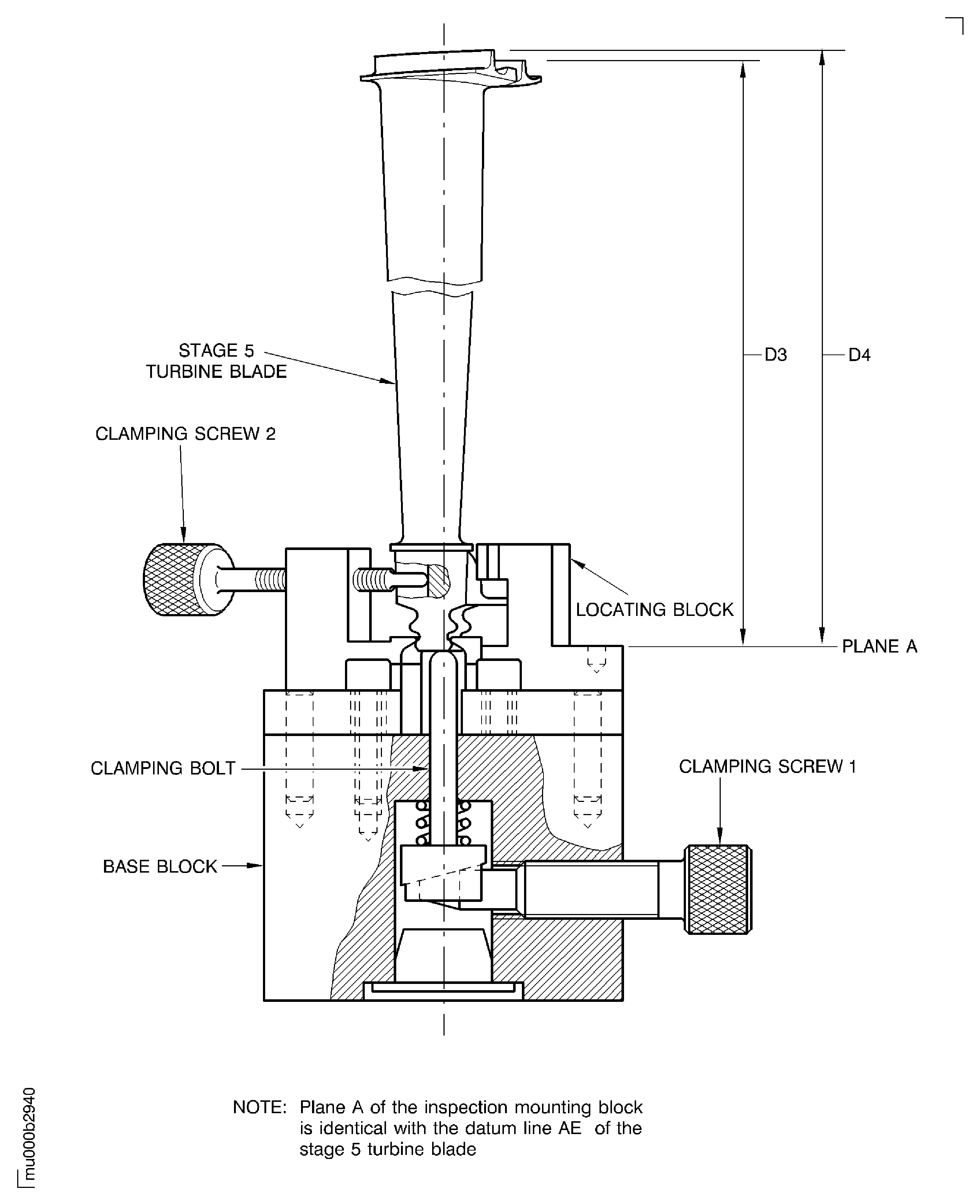 Measure the dimension D3 between the front knife edge seal and the plane A on the inspection mounting block.