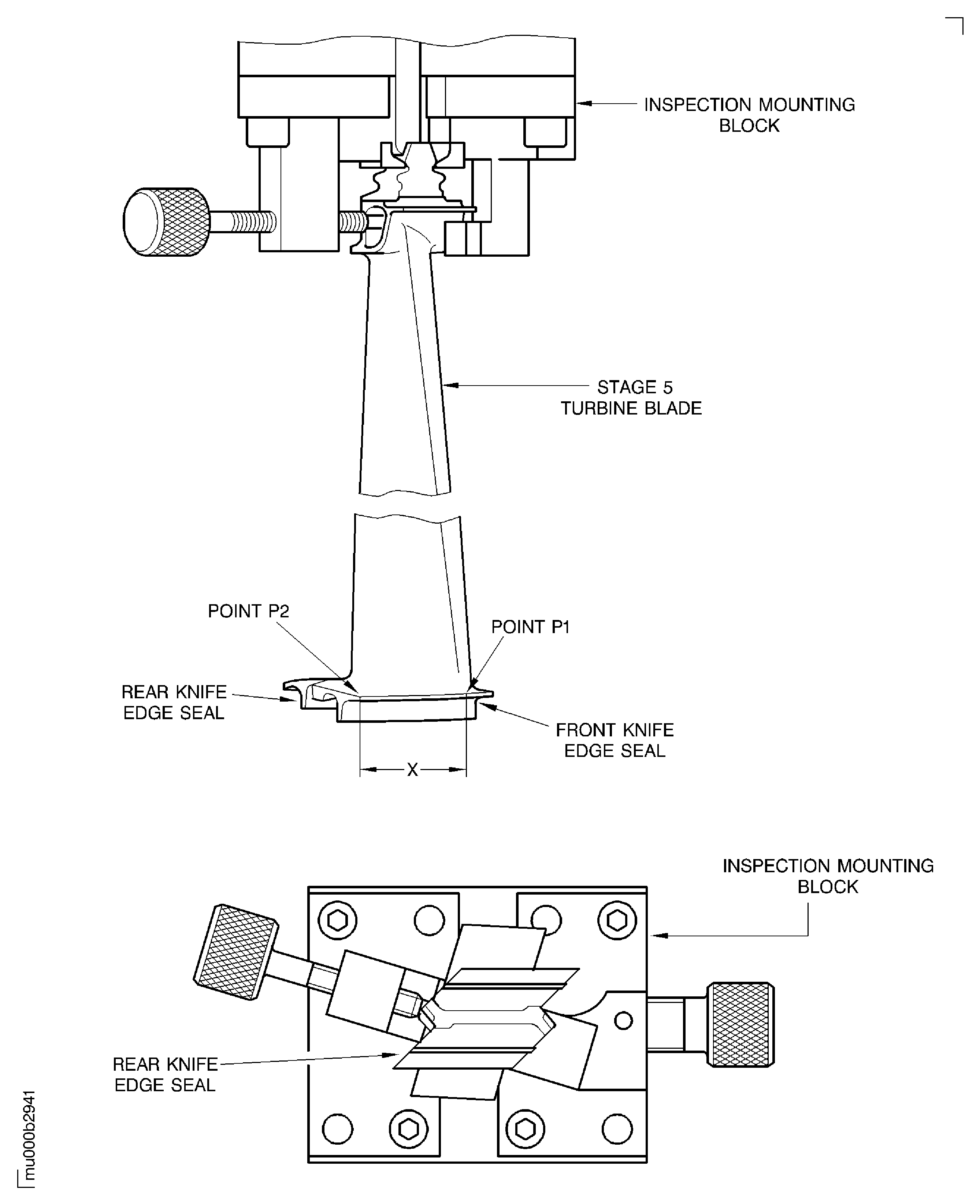 Install the stage 5 turbine blade with the convex side down on to IAE IAE 2M14190 Inspection gage 1 off. Make sure that the stage 5 turbine blade is correctly installed on the inspection gage.