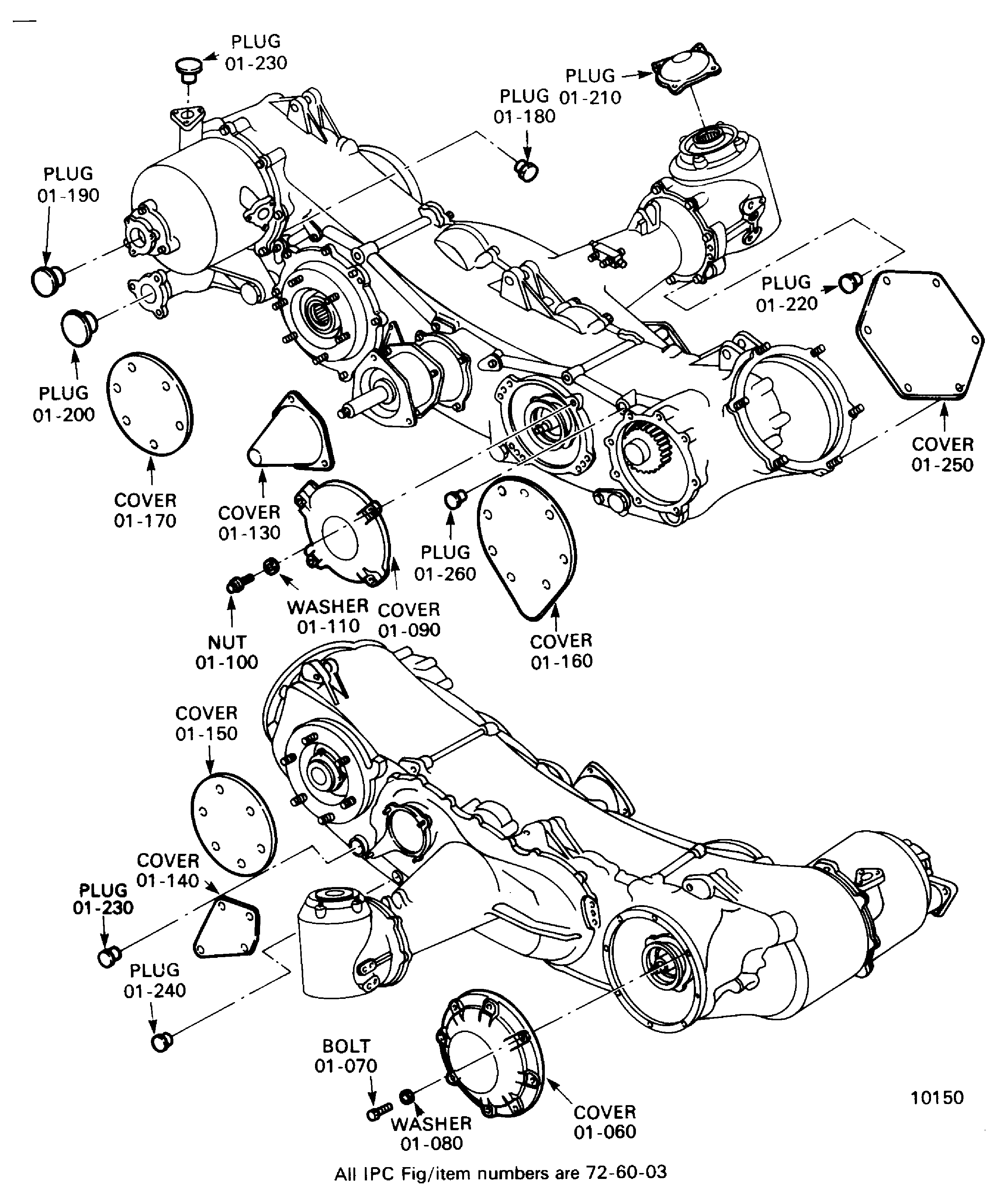 Install the plug Transportation Fittings (72-60-03, 01-210) on the transmission assembly (angle gearbox/intermediate case surface).