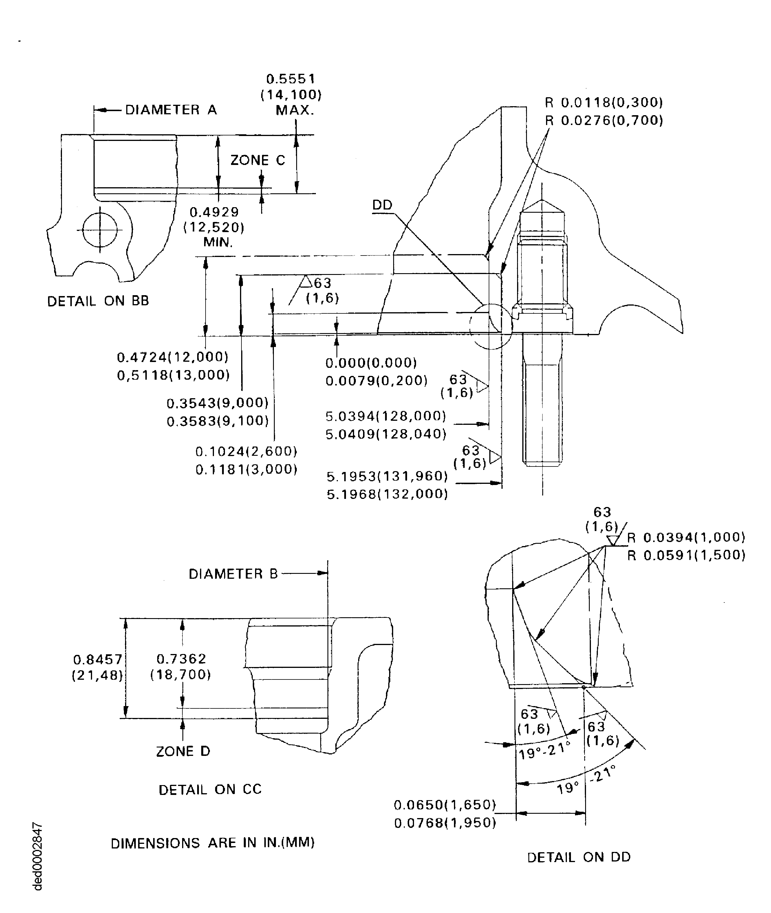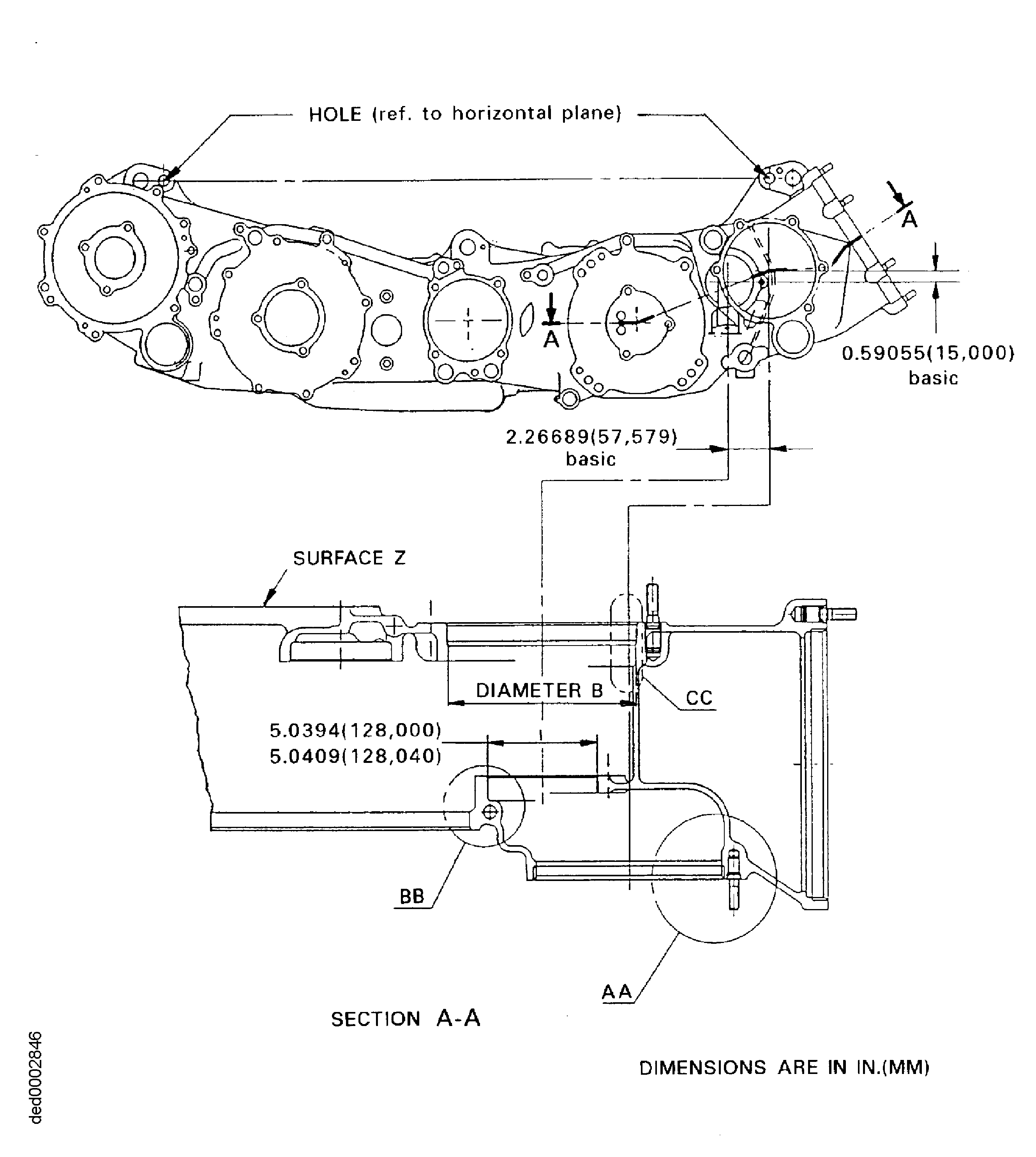 The position of the bore must be within 0.0031 in. (0.080 mm) FIR in relation to diameter A index 15 and diameter B index 22 (if diameter A or B are damaged refer to zone C index 18 or zone D index 19).