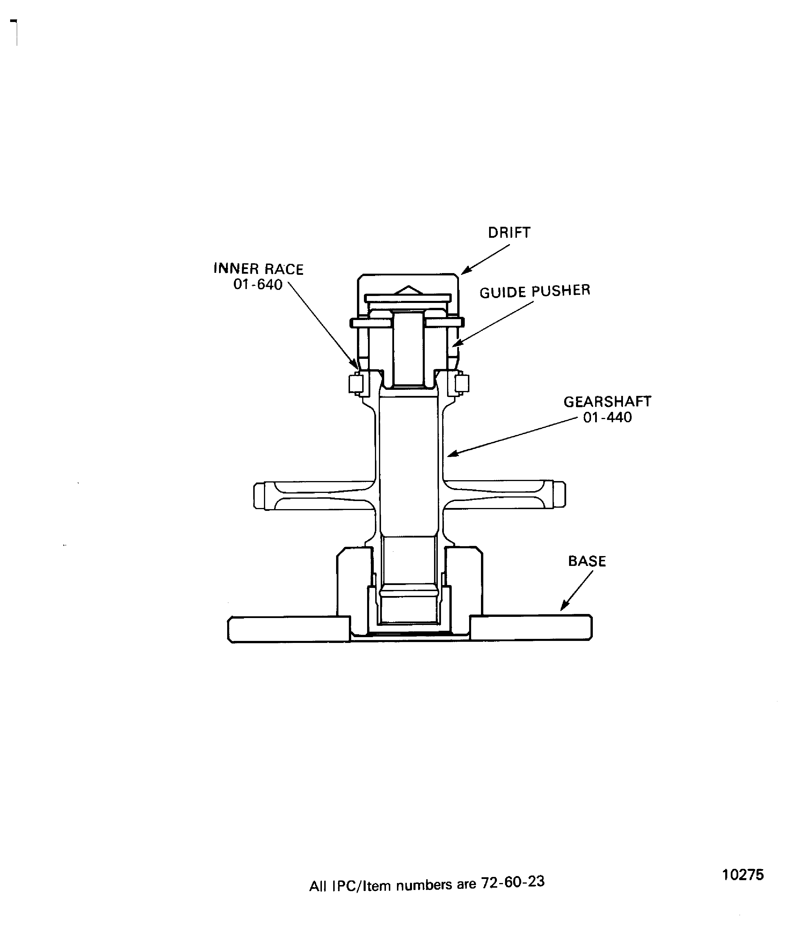 Put IAE 1F10174 Drift 1 off on the inner race of the roller bearing with the guide pusher of the drift in to the ID of the gearshaft.