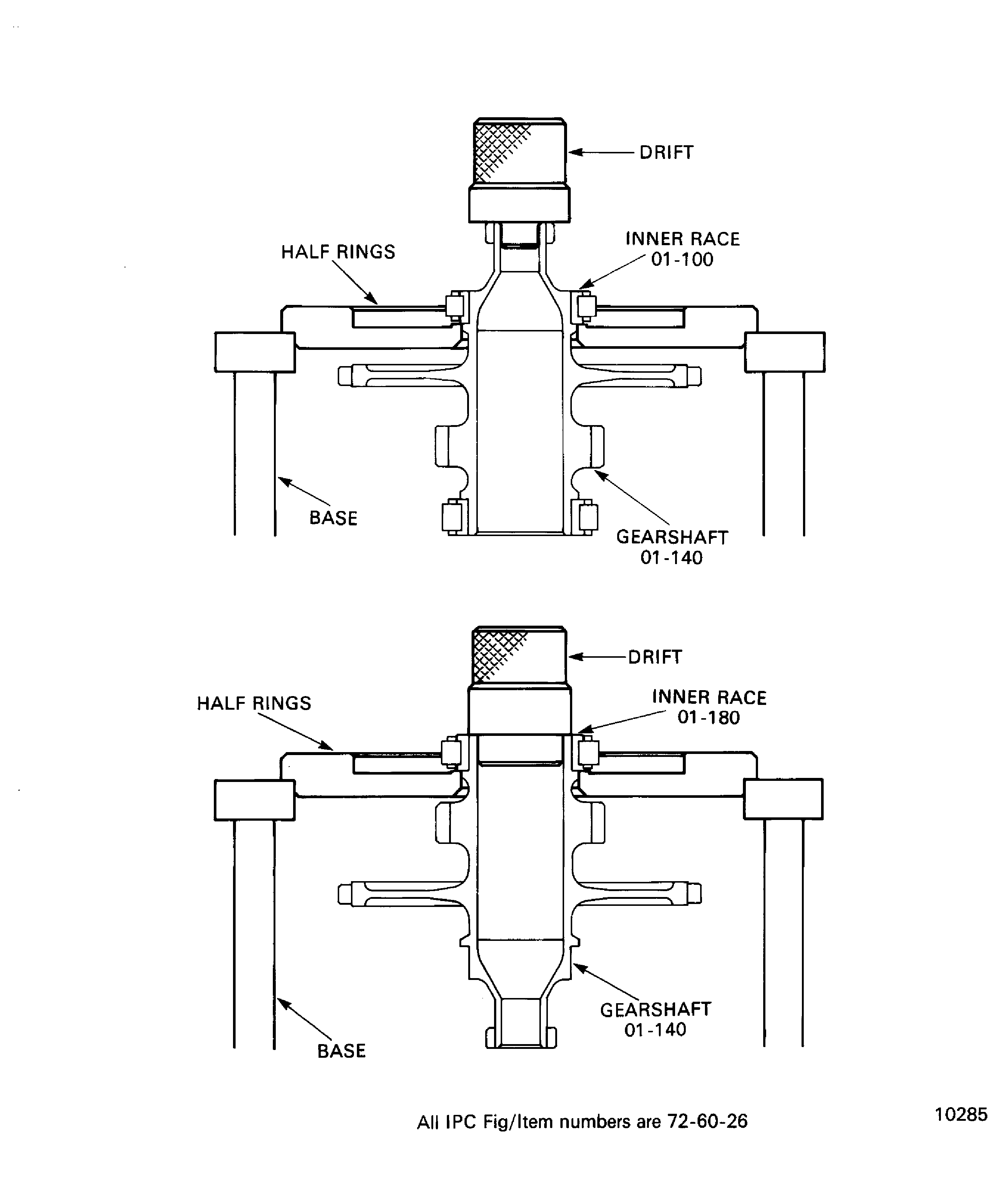 Install IAE 1F10235 Drift 1 off into the ID of the gearshaft. Push the drift until the gearshaft is fully removed from the inner race of the roller bearing. Use arbor press or equivalent.
