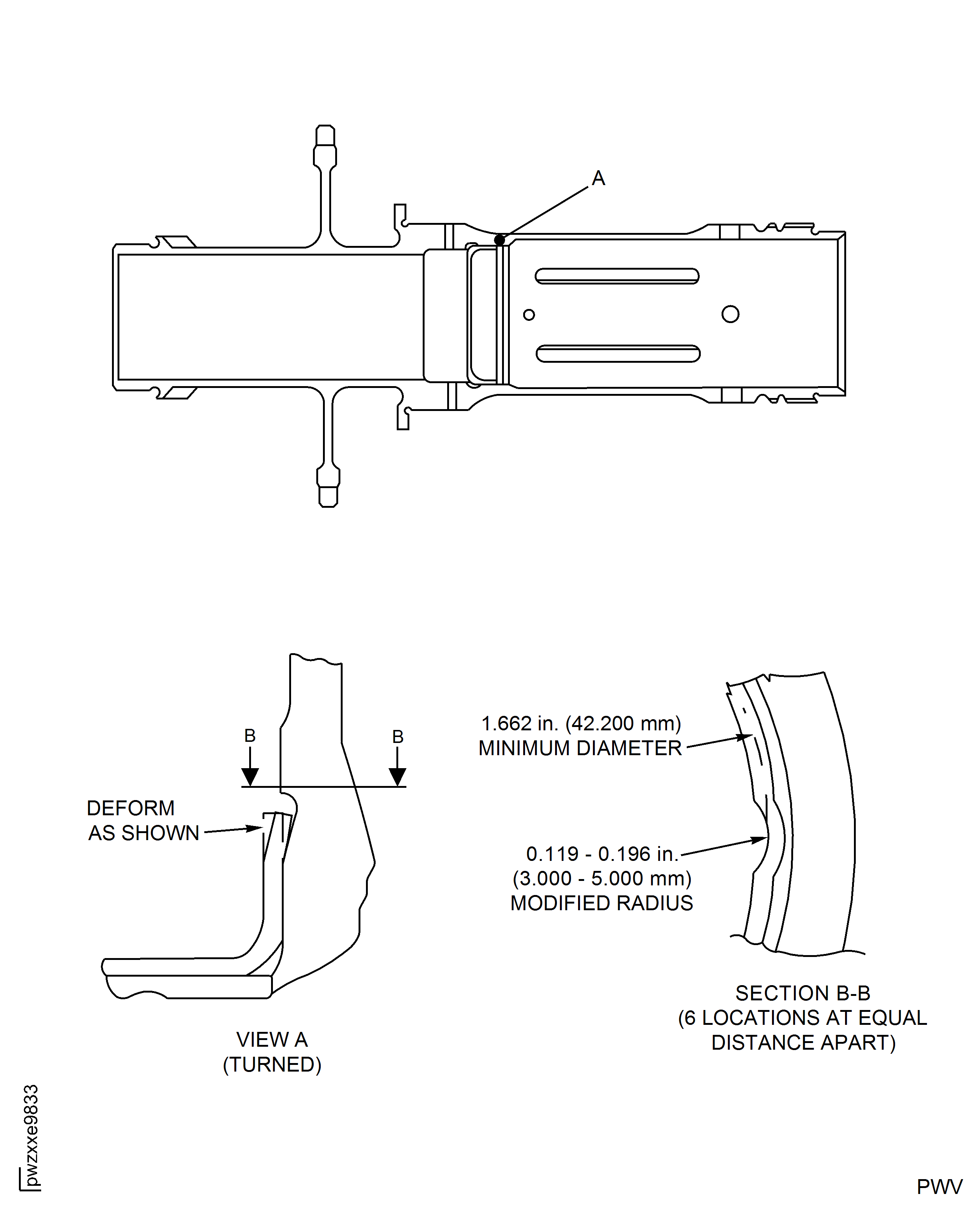 Do local FPI in accordance with SPM TASK 70-23-05-230-501, CoMat 06-022 FLUORESCENT PENETRANT (POST-EMULSIFIED ULTRA HIGH SENSITIVITY). Cracks are not allowed.