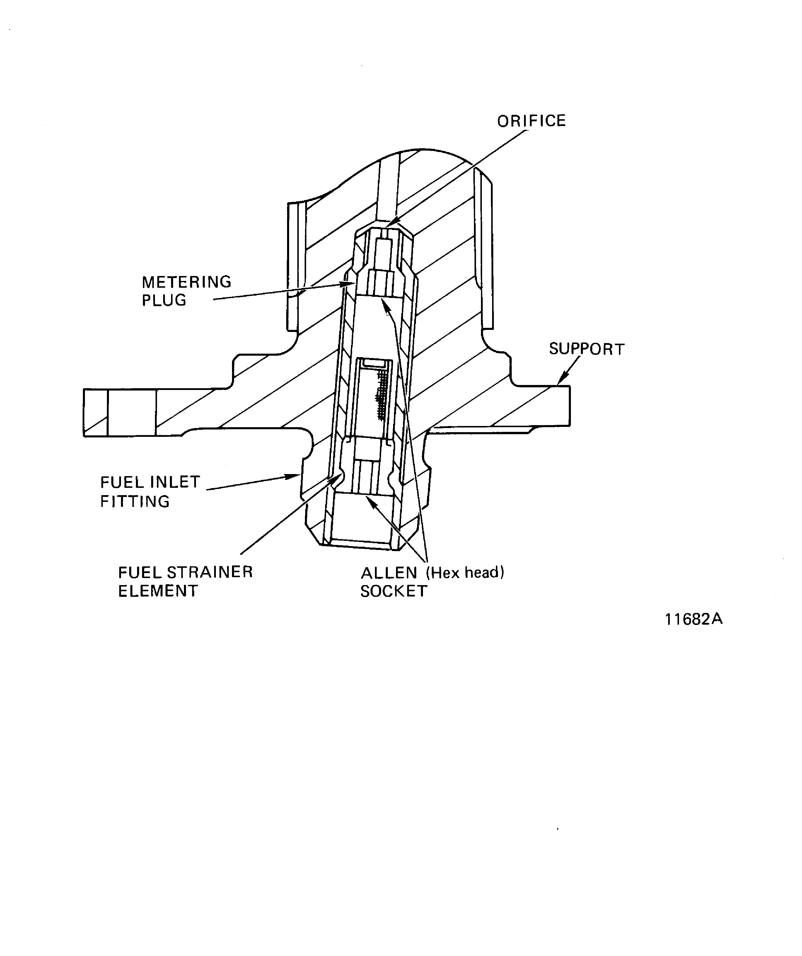 THE FUEL METERING PLUG AND SUPPORT ASSEMBLY ARE A MATCHED SET AND MUST BE KEPT TOGETHER.While the assembly is hot, connect it to the power arm vise. Remove the strainer element or the metering plug