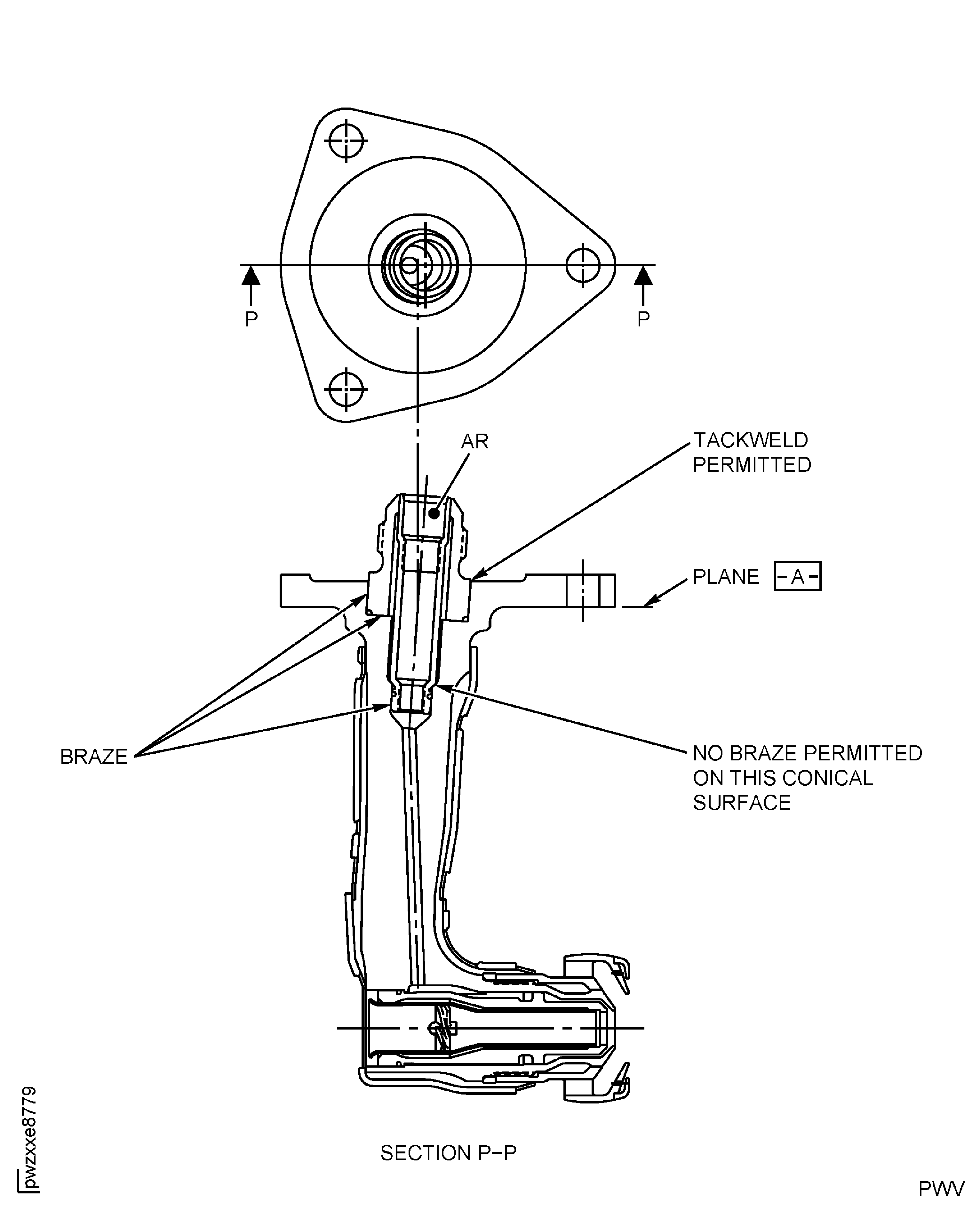 FUEL NOZZLE SUPPORT ASSEMBLY CONTAINS ADDITIONAL CoMat 03-114 BRAZE FILLER METAL 82Au-18Ni BRAZE JOINTS AT THE INNER HEAT SHIELD, INNER AIR SWIRLER AND CENTER BODY. BRAZE PROCESS CONDUCTED BY SPM TASK 70-31-14-310-501 PROCESS WINDOW MUST ENSURE MINIMAL BRAZE FLOW AT THE EXISTING BRAZE JOINTS. WHEN YOU DO A VISUAL INSPECTION OF THE JOINTS, THE JOINTS MUST SHOW 100 PERCENT LINE OF BRAZE AT THE OUTER END OF THE JOINT.Area of braze coverage must not be less than 80 percent of the mating portions of assembly.