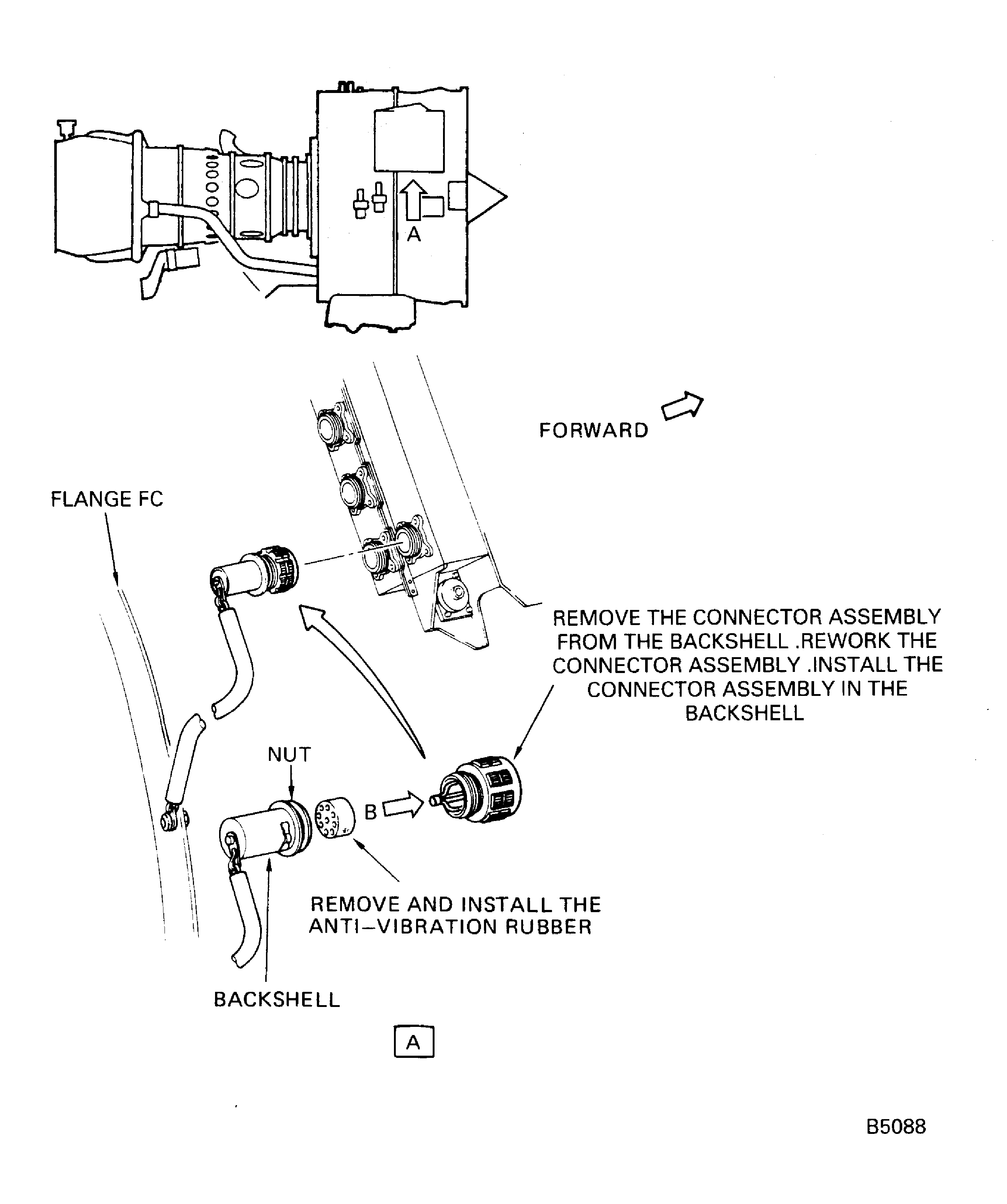 MAKE SURE YOU TEMPORARILY TAG THE REMOVED DATA ENTRY PLUG CONNECTOR AND ANTI-VIBRATION RUBBER WITH THE APPLICABLE ENGINE SERIAL NUMBER. YOU MUST INSTALL THE REMOVED PARTS AGAIN IN THE SAME BACKSHELL OR THE WIRE COMBINATION FOR THE ENGINE SERIAL NUMBER SPECIFIED WILL NOT BE CORRECT.Remove the backshell and the anti-vibration rubber from the data entry plug connector.