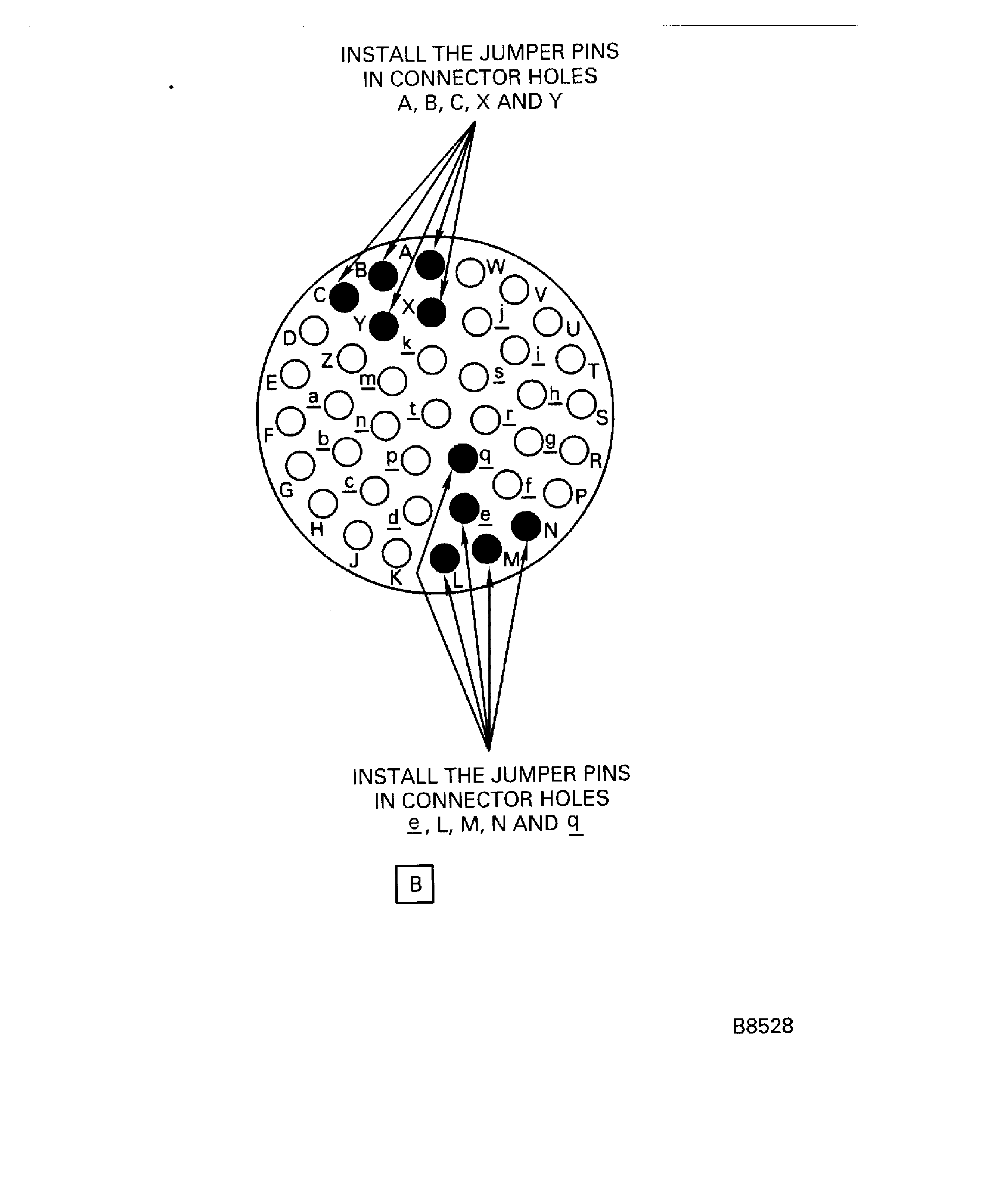 Install either the 5A9214 or the 2A2036 jumper pins into connector holes e L, M, N and q.