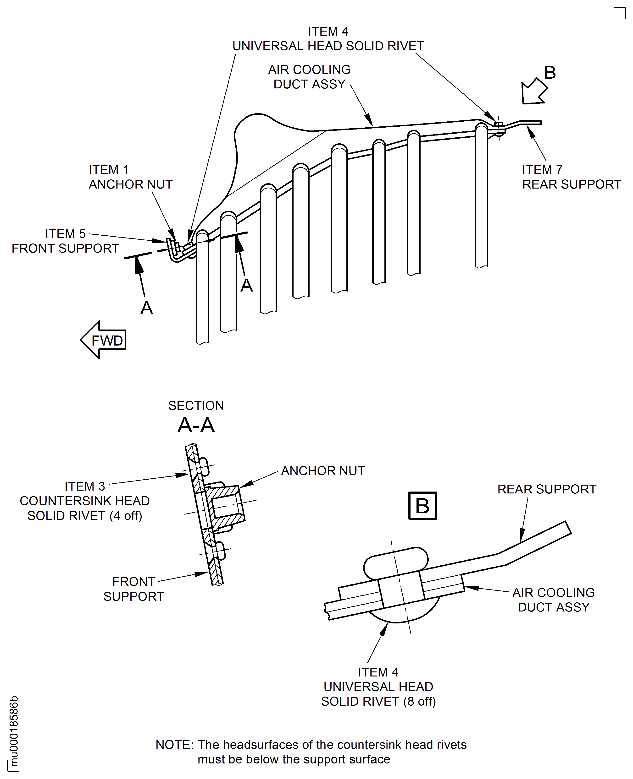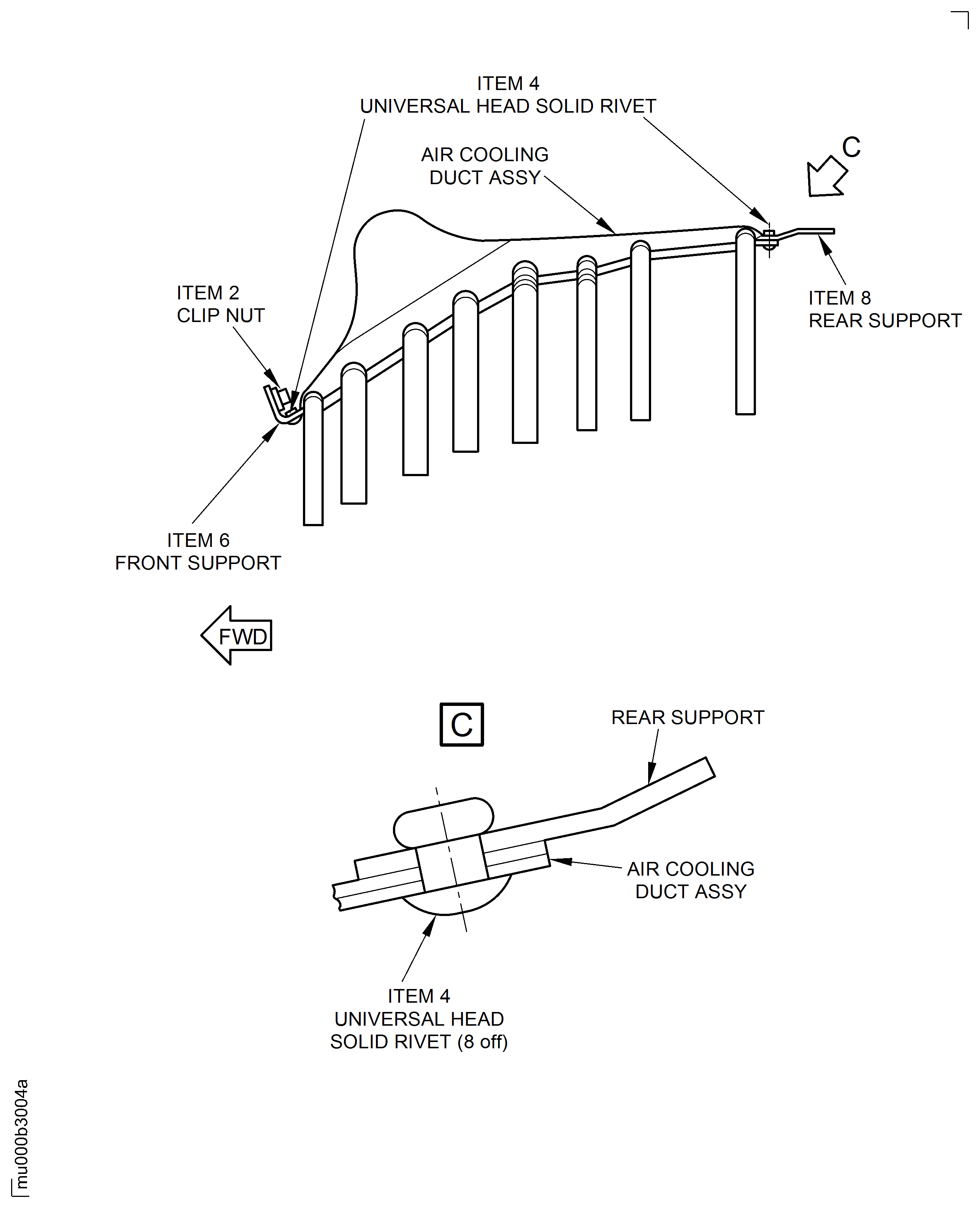 Install the front support with the universal head solid rivets on to the upper and lower air duct cooling assemblies.