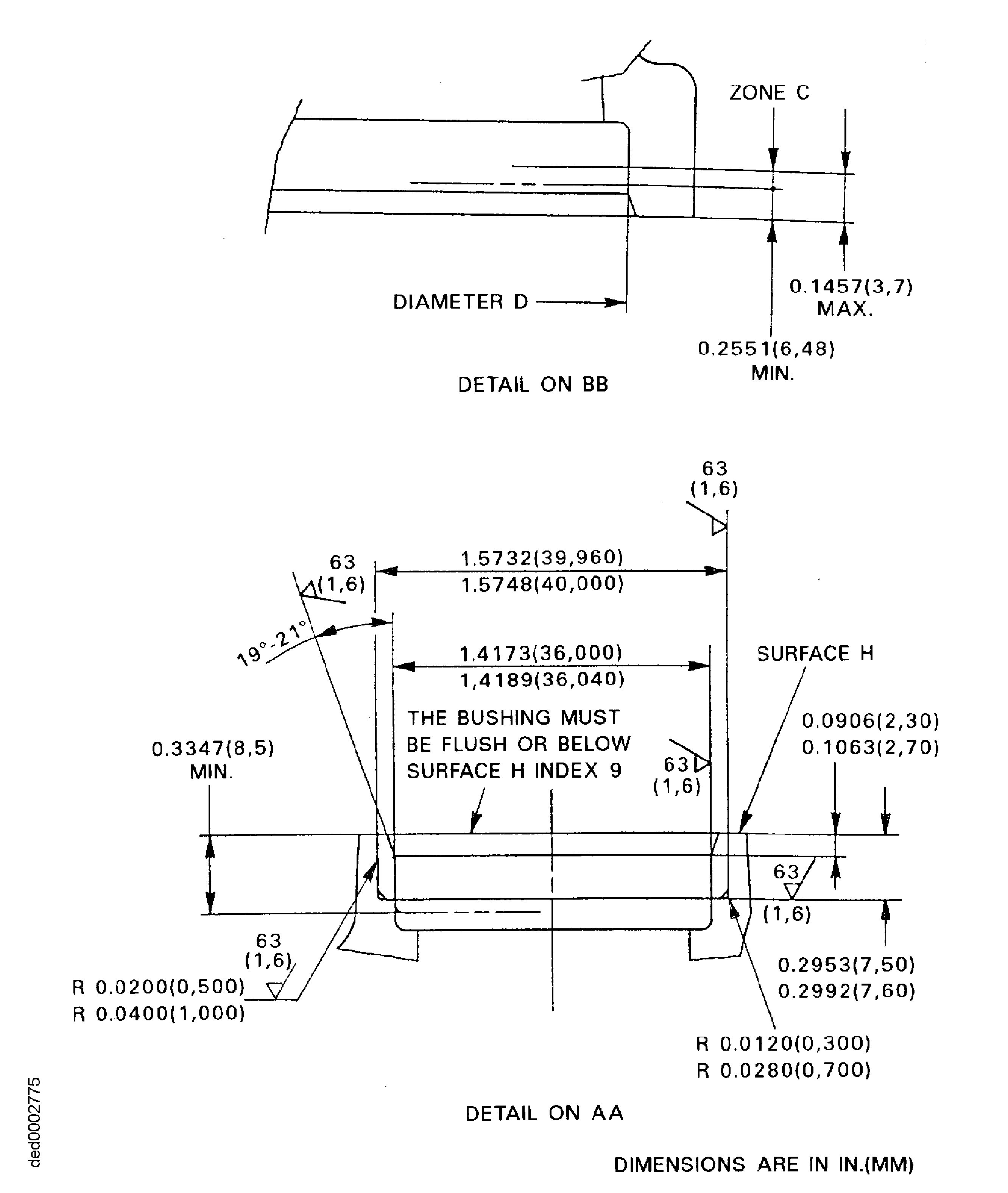 The concentricity of the bore must be within 0.012 in. (0.300 mm) FIR in relation to diameter D index 4, in zone C index 1.