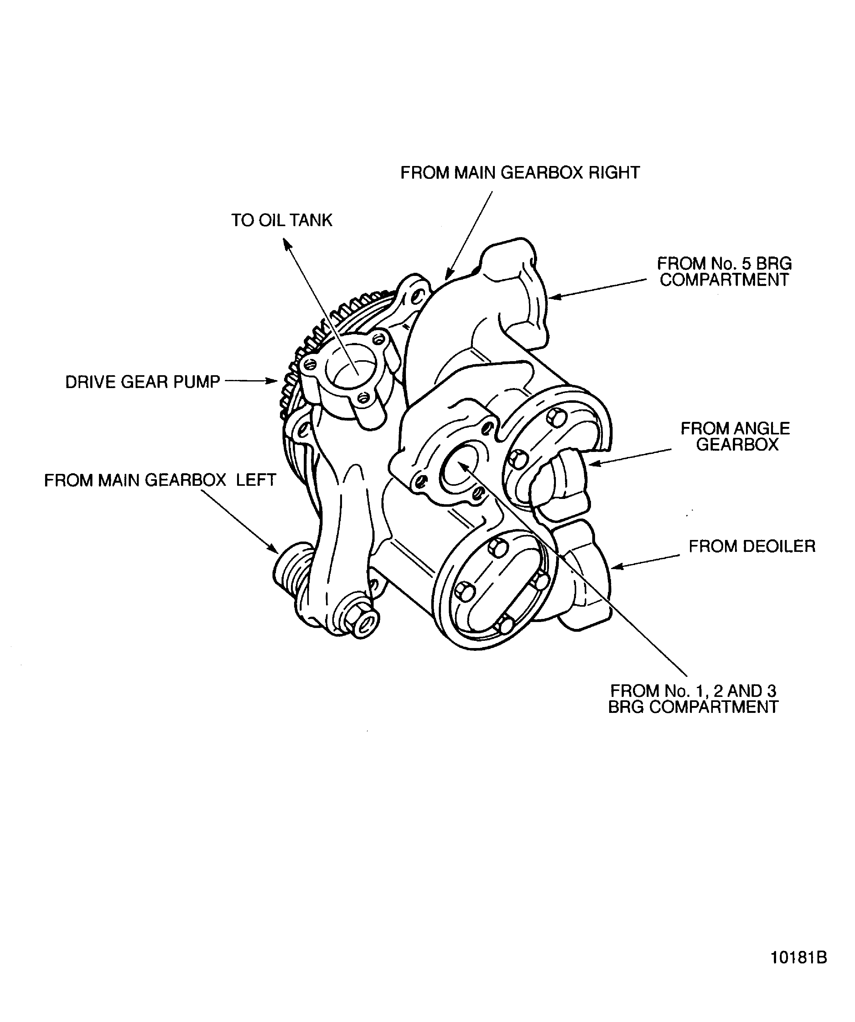 The pump is driven through a gearmesh with an idler gearshaft, driven in turn by the angle gearbox input gearshaft. The direction of drive rotation is clockwise. The six stages of the pump get back the oil from: