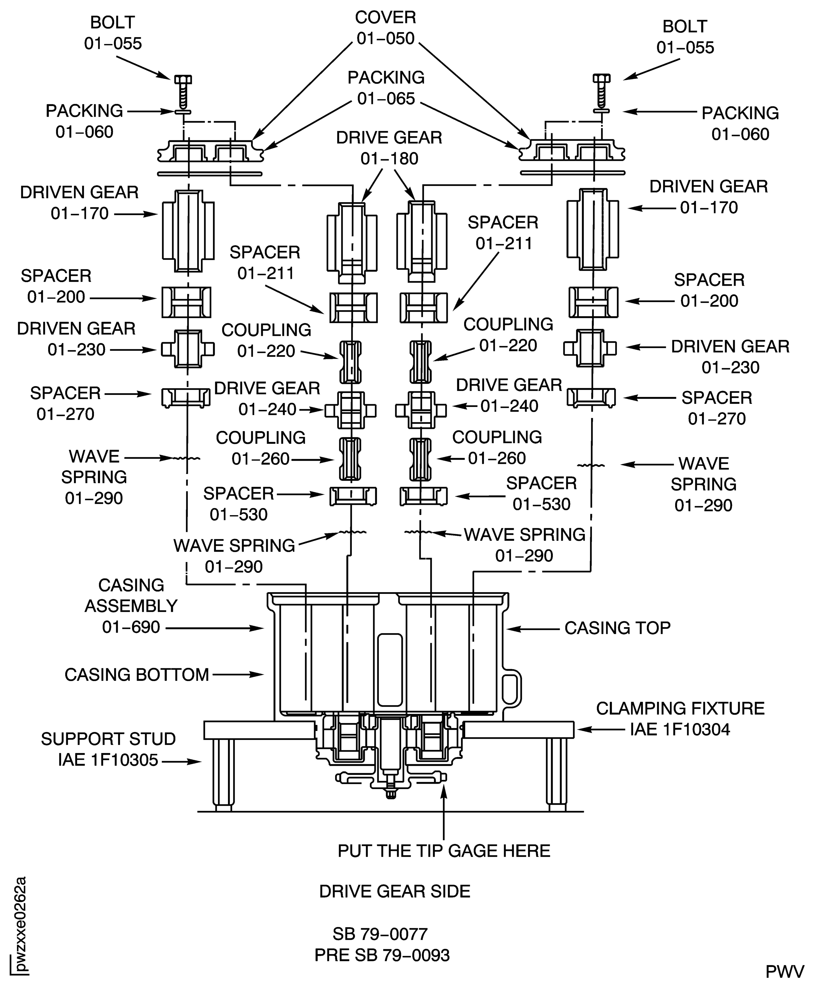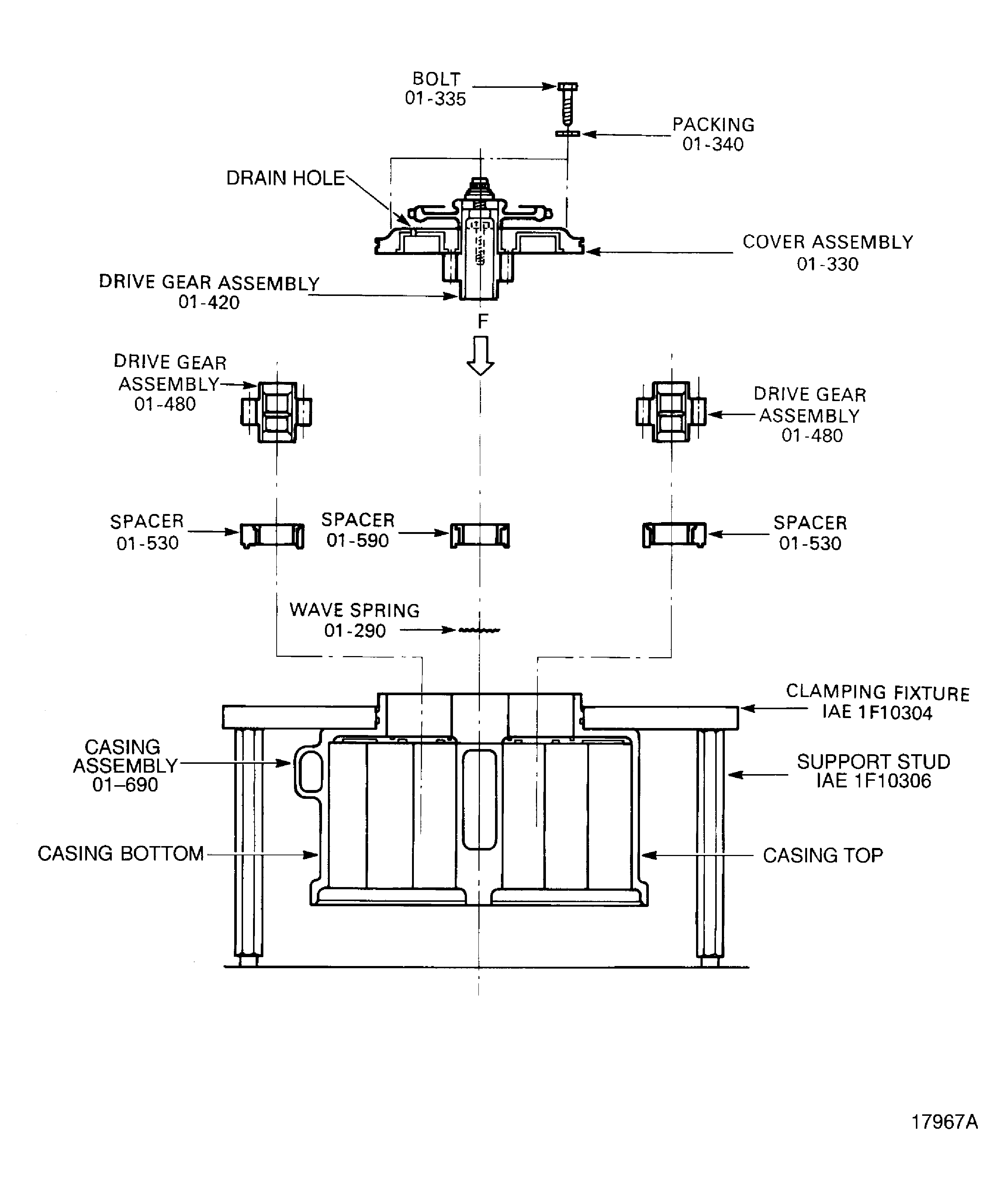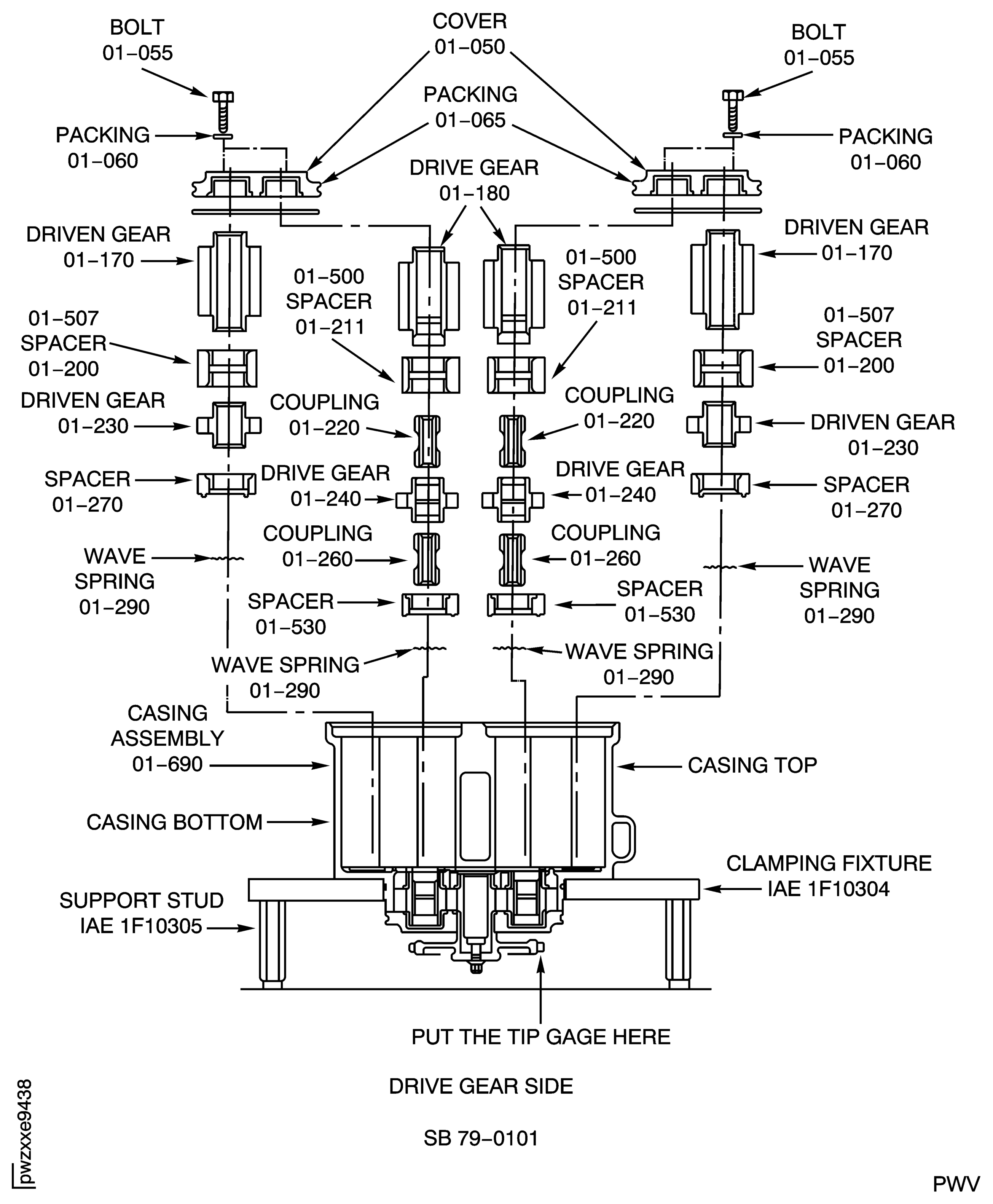 Install the (01-690) casing assembly to the IAE 1F10304 Clamping fixture, put the drive gear side turned to the top.