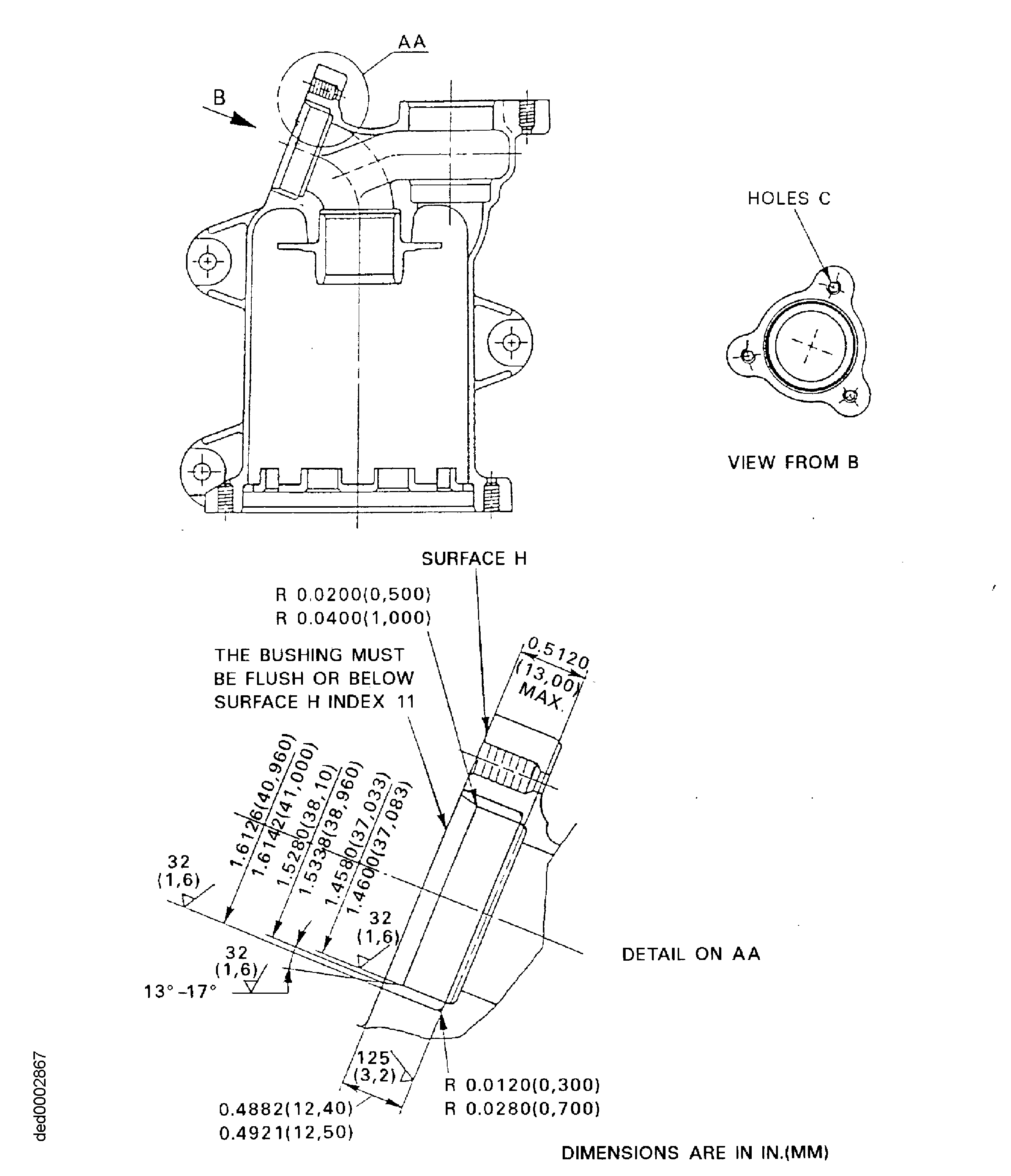 The true position of the bore must be within 0.0200 in. (0.500 mm) FIR in relation to holes C, index 1.