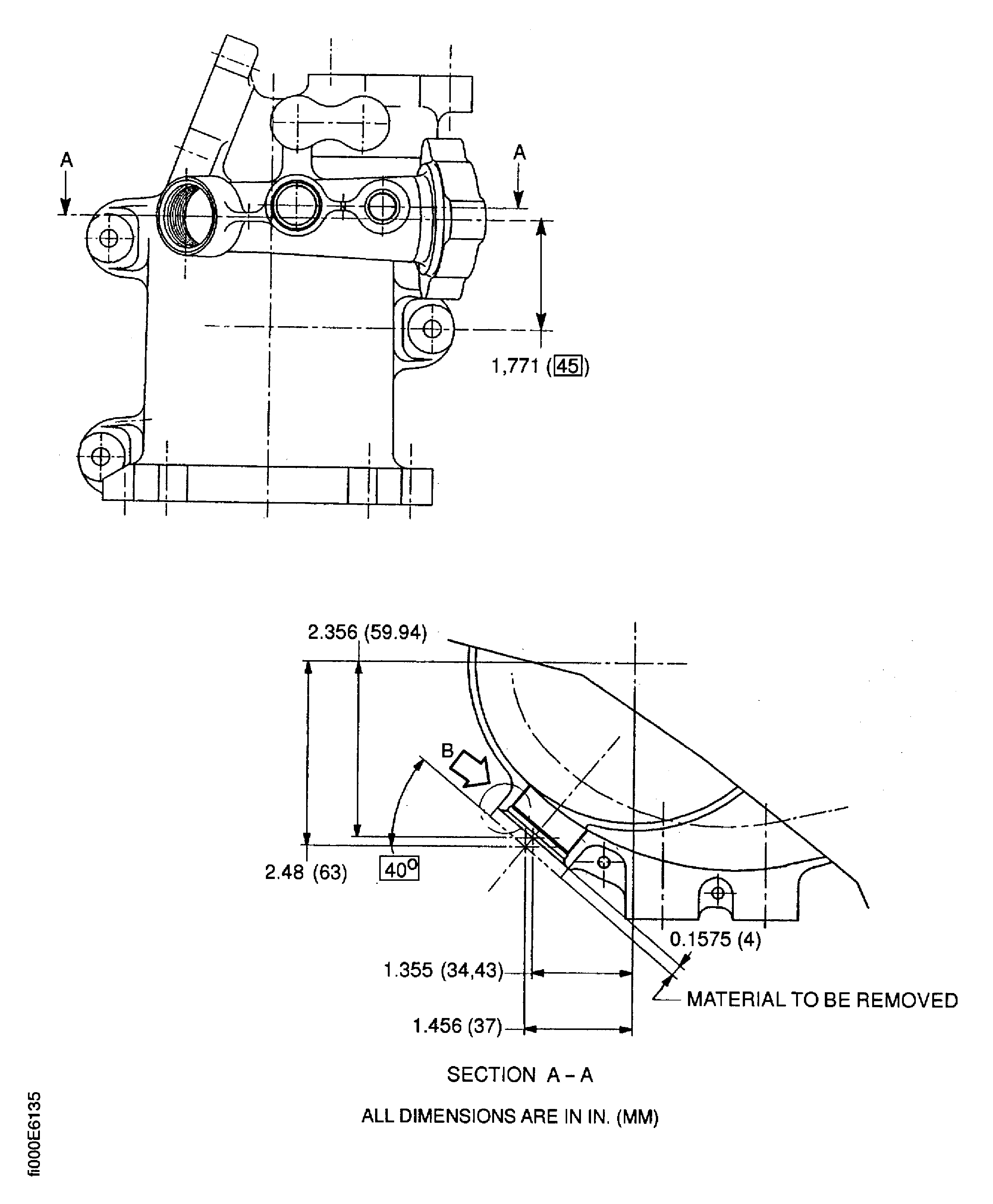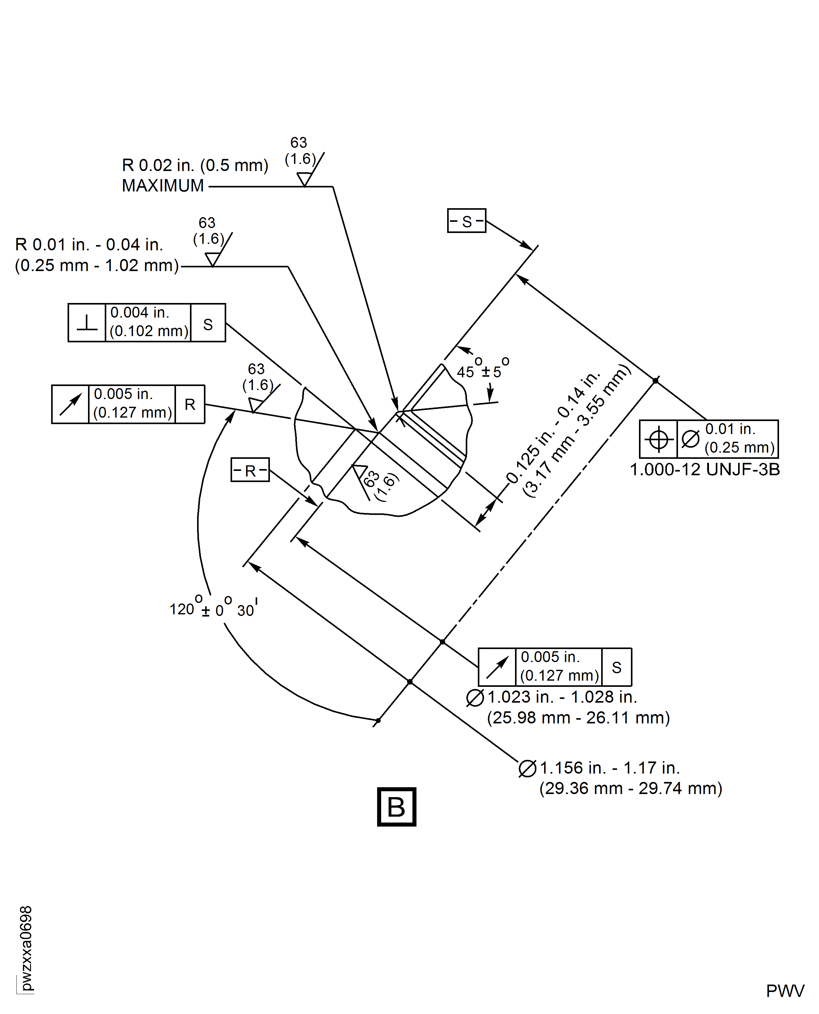 Remove 0.1575 in. (4 mm) of material. The perpendicularity of the surface must be within 0.004 in. (0.102 mm) FIR in relation to Diameter S.