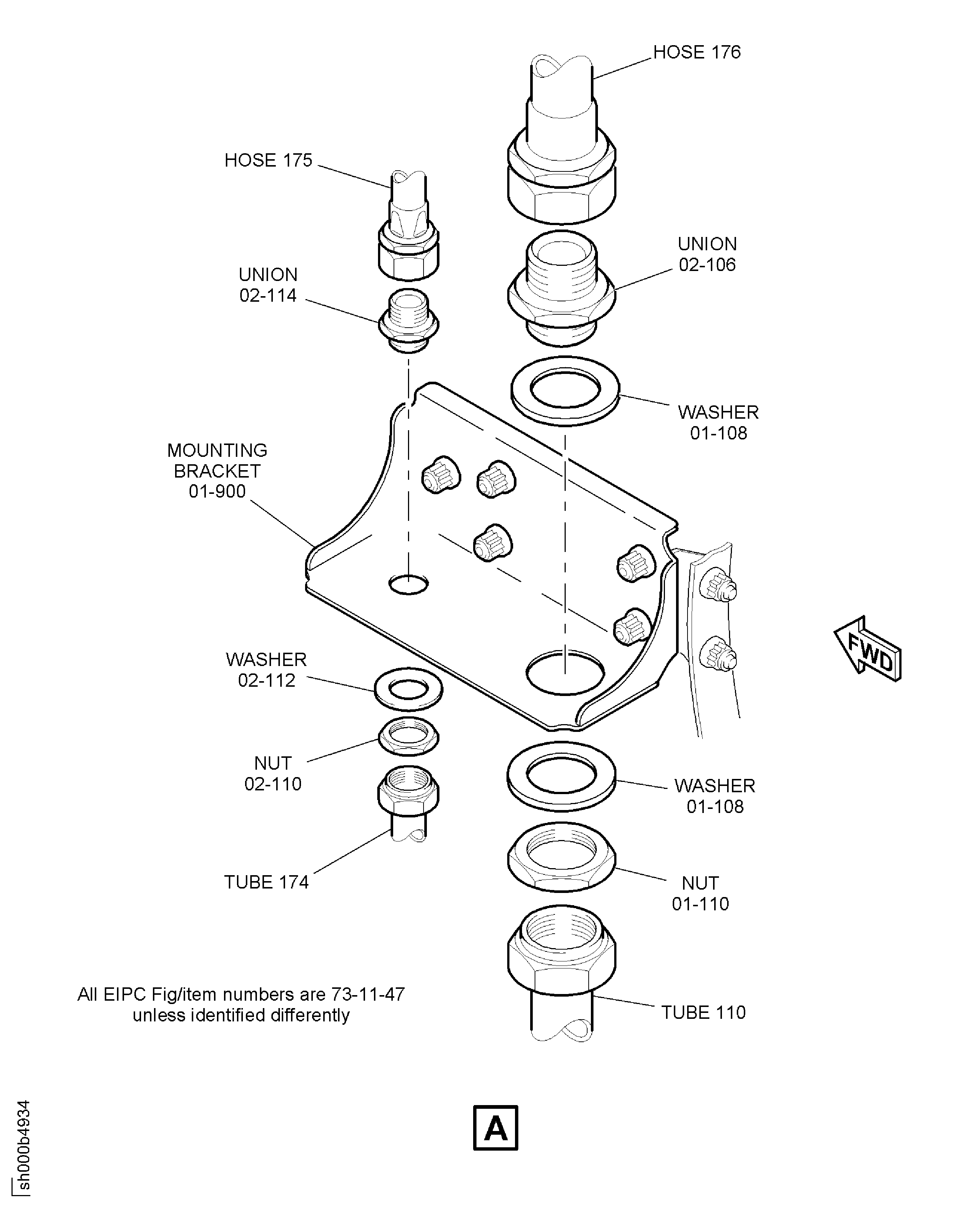 Connect the hose 175 to the union FUEL SYSTEM TUBES (RIGID)-POWER PLANT (73-11-47, 02-114) with the nut FUEL SYSTEM TUBES (RIGID)-POWER PLANT (73-11-47, 02-110) and the washer FUEL SYSTEM TUBES (RIGID)-POWER PLANT (73-11-47, 02-112). Tighten the hose 175 nut but do not torque the nut at this time.