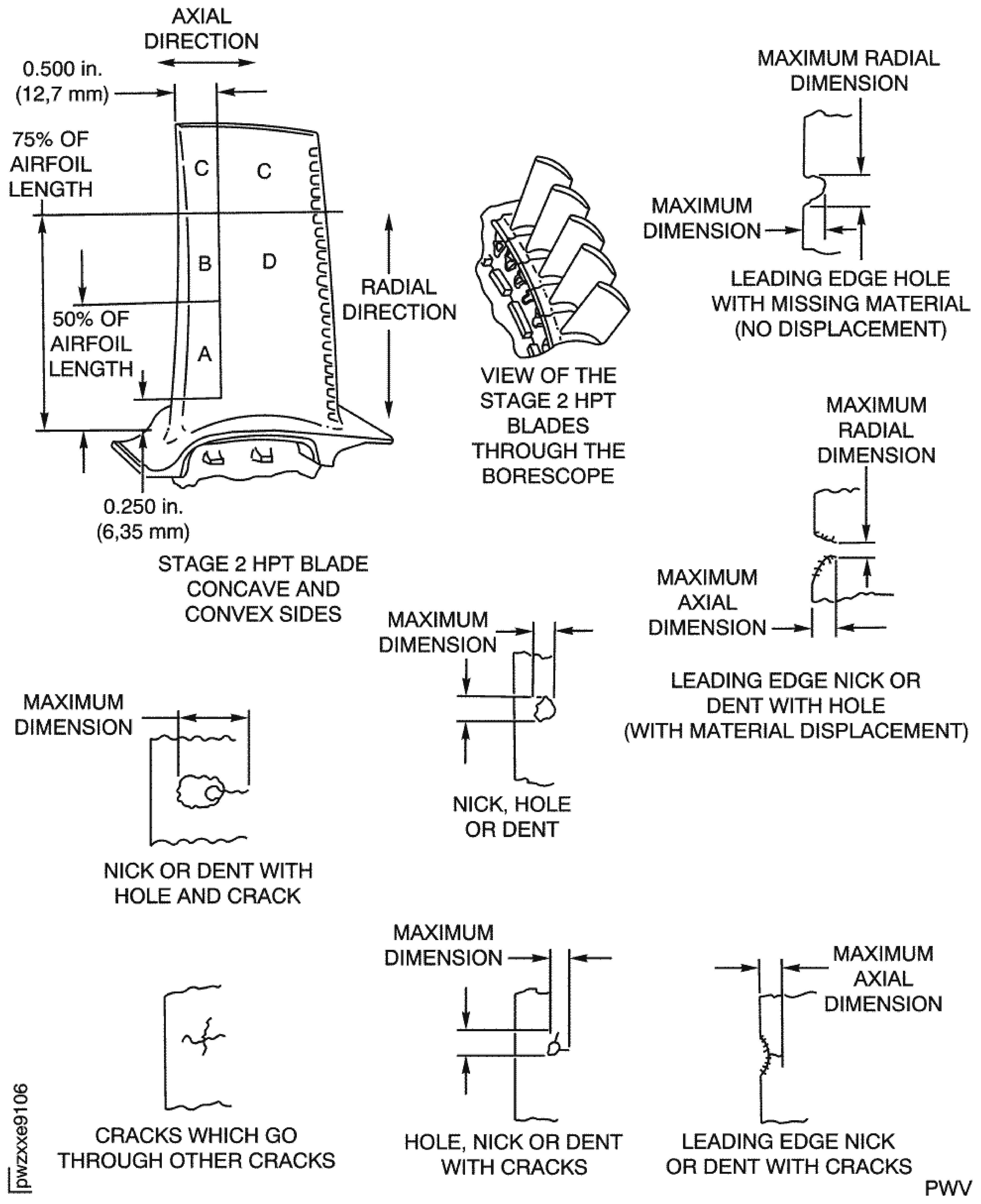 SUBTASK 72-00-00-220-078 Examine the Blades for Nicks, Dents and Holes on the Airfoil of the Stage 2 HPT Blades