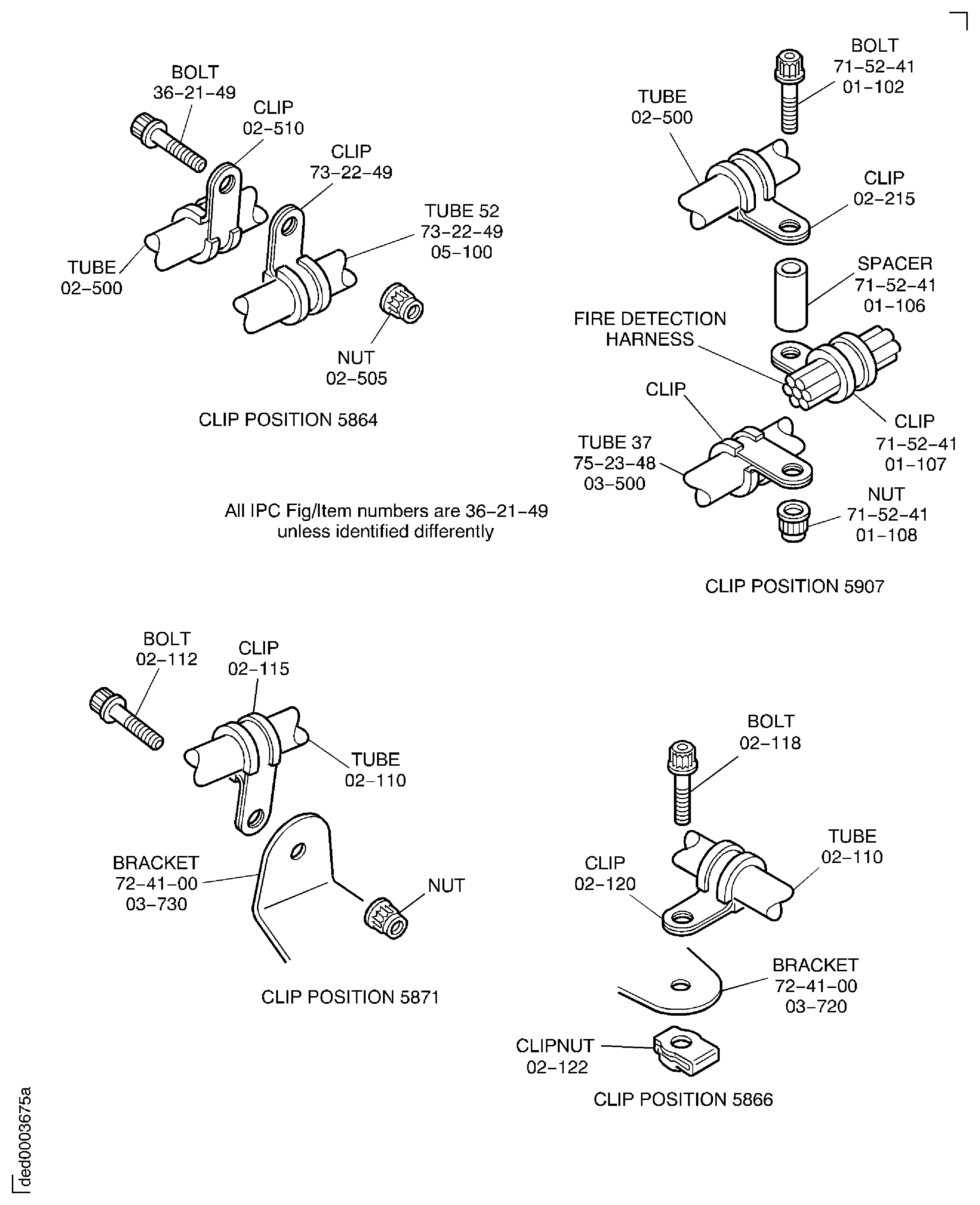 Attach the tube PNEUMATIC-PRESSURE INDICATING TUBES (36-21-49, 02-500) at clip position 5907 to the fire detection harness tube clip and the clip at tube 37 with the clip PNEUMATIC-PRESSURE INDICATING TUBES (36-21-49, 02-515) bolt, spacer and nut.