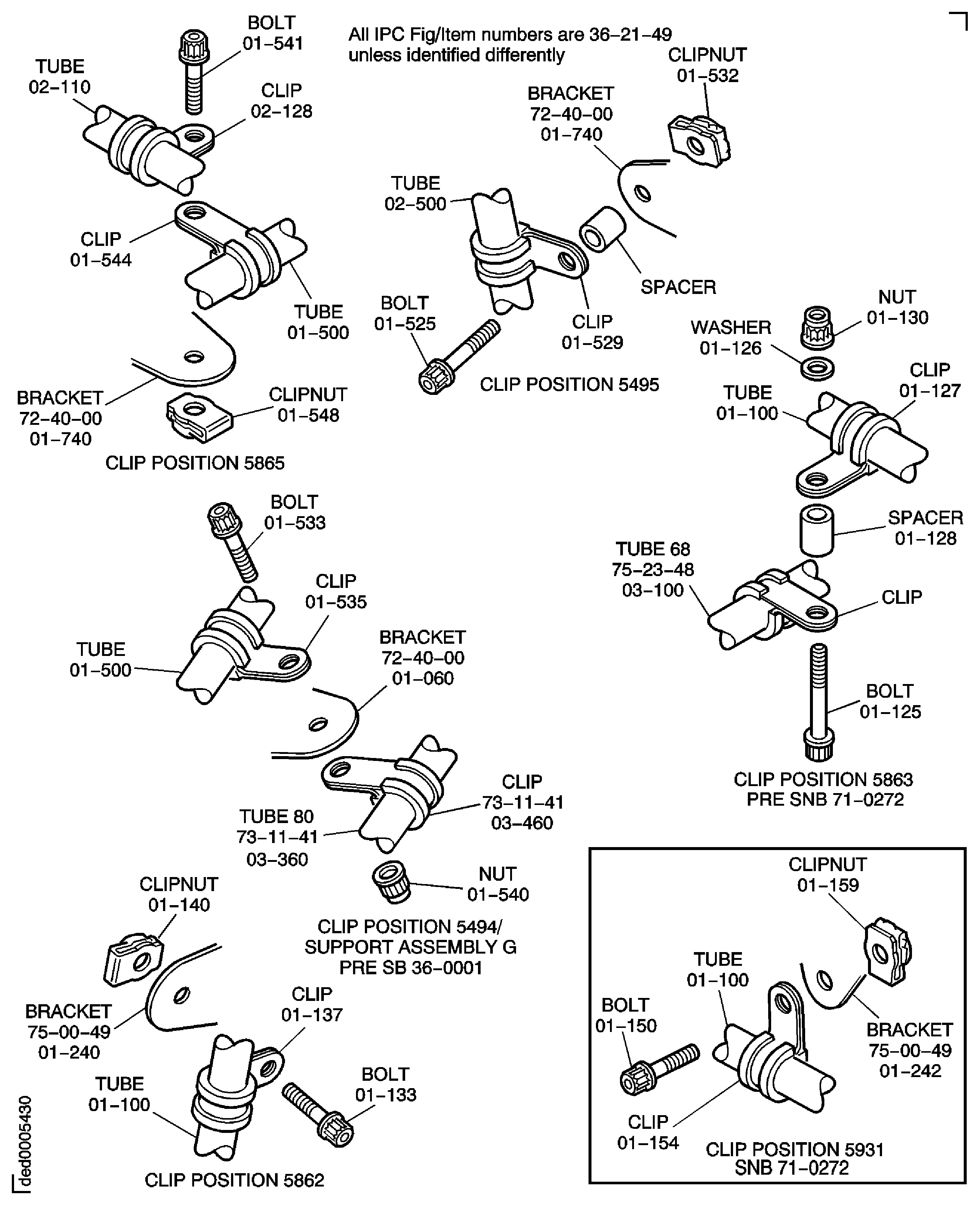 SBN 36-0001 deleted installation of tube 36-21-49,01-500 at clip position 5494, Support Assembly G.