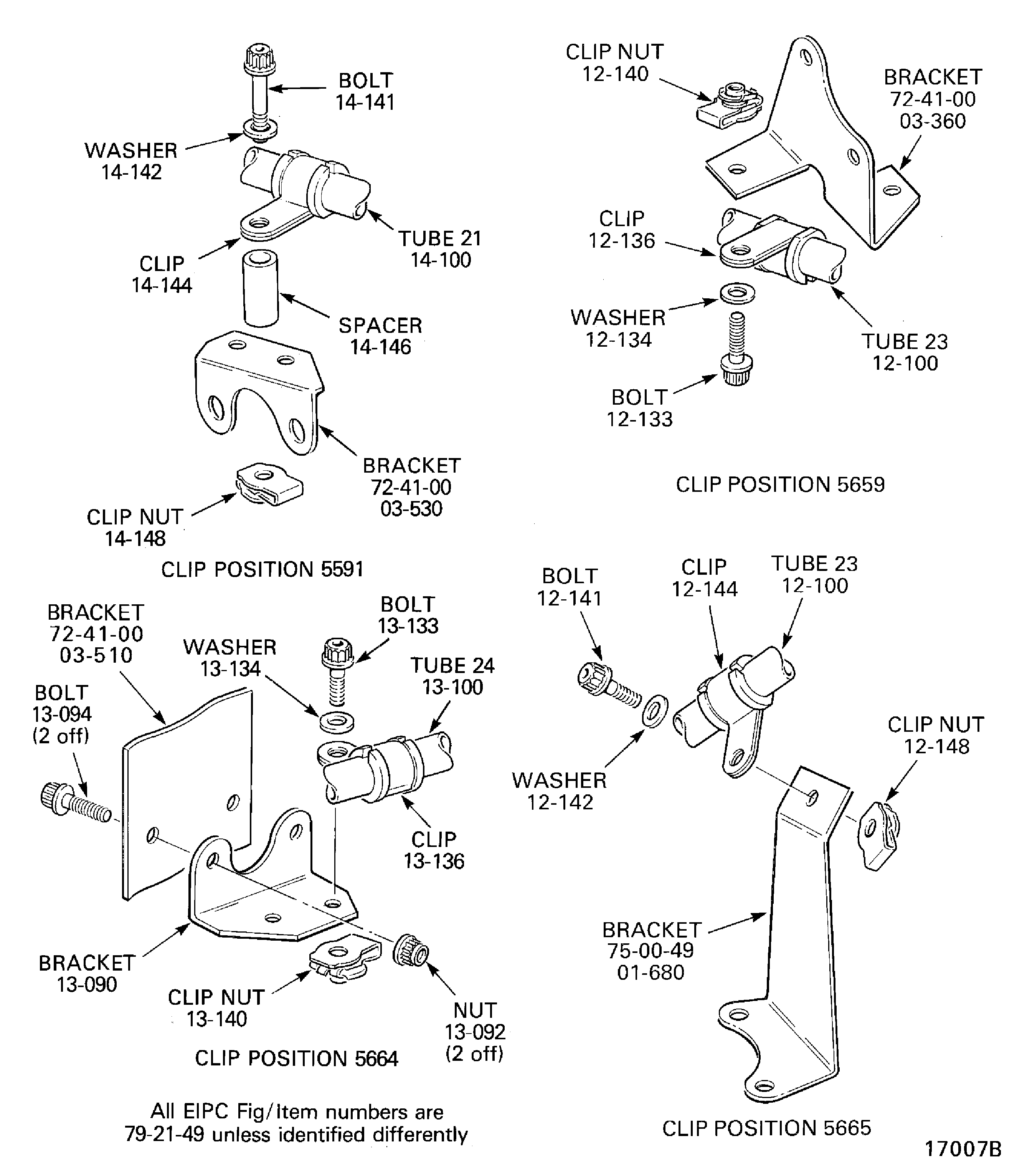 Attach the bracket OIL-PRESSURE OIL TUBES-ENGINE (79-21-49, 13-090) to the bracket ENGINE-SECURING FEATURES-HP COMPRESSOR CASES (72-41-00, 03-510) with the two bolts OIL-PRESSURE OIL TUBES-ENGINE (79-21-49, 13-094) and the two nuts OIL-PRESSURE OIL TUBES-ENGINE (79-21-49, 13-092) at the clip position 5664. Torque the nuts to 36 to 45 lbfin (4 to 5 Nm).