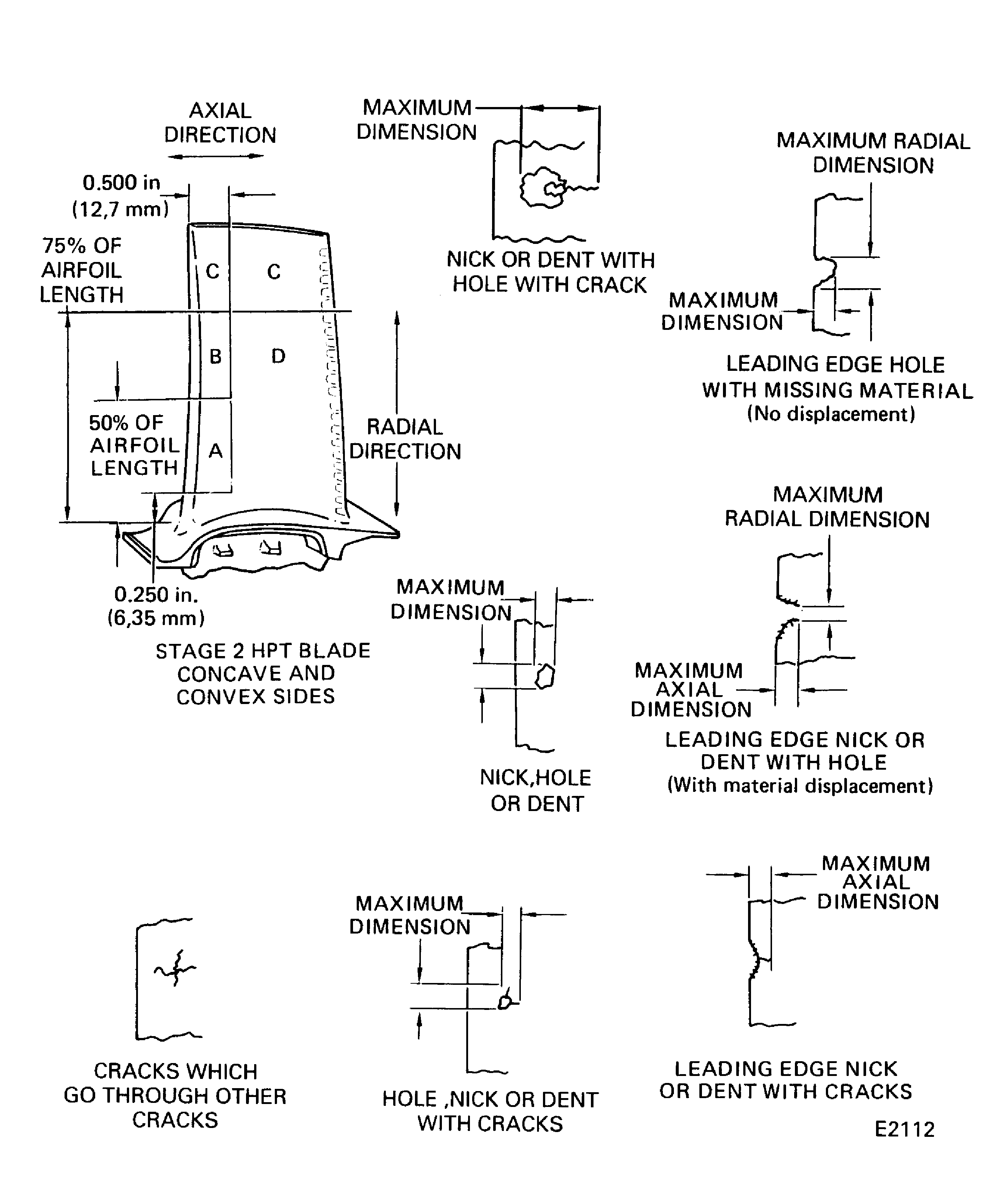 If the nick or dent is in area A, has cracks and the nick or dent plus crack is more than 0.040 in. (1.02 mm) long axially and/or more than 0.070 in. (1.78 mm) long radially
