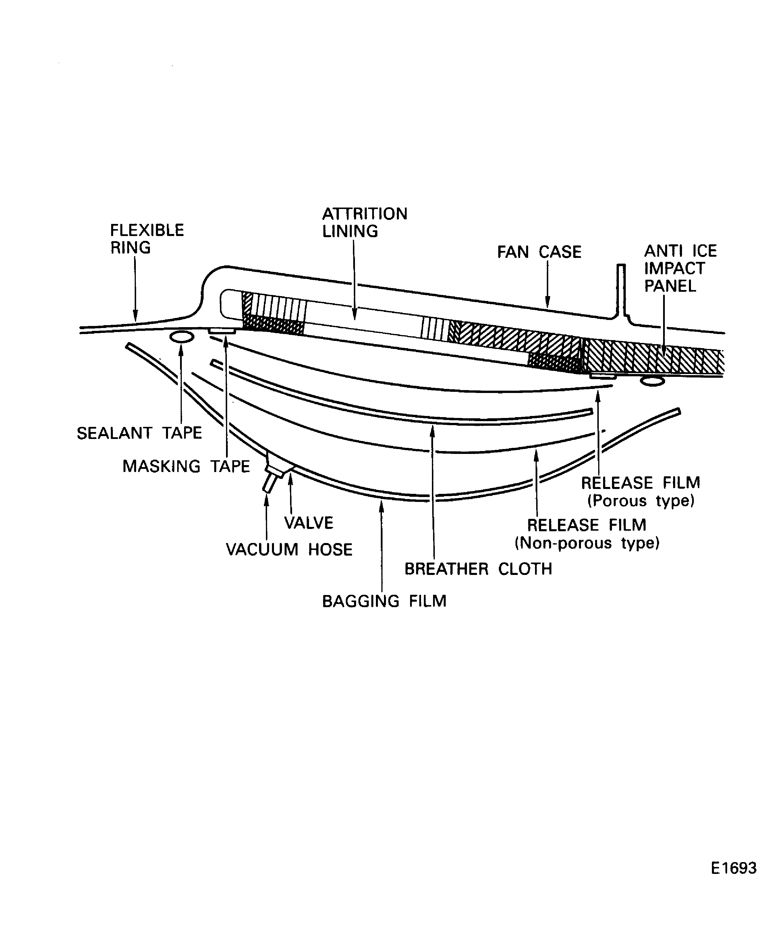 Seal the edges of the bagging film to the metal surface of the fan case and the anti-ice impact panels with CoMat 02-225 TAPE, VACUUM BAG SEALANT.