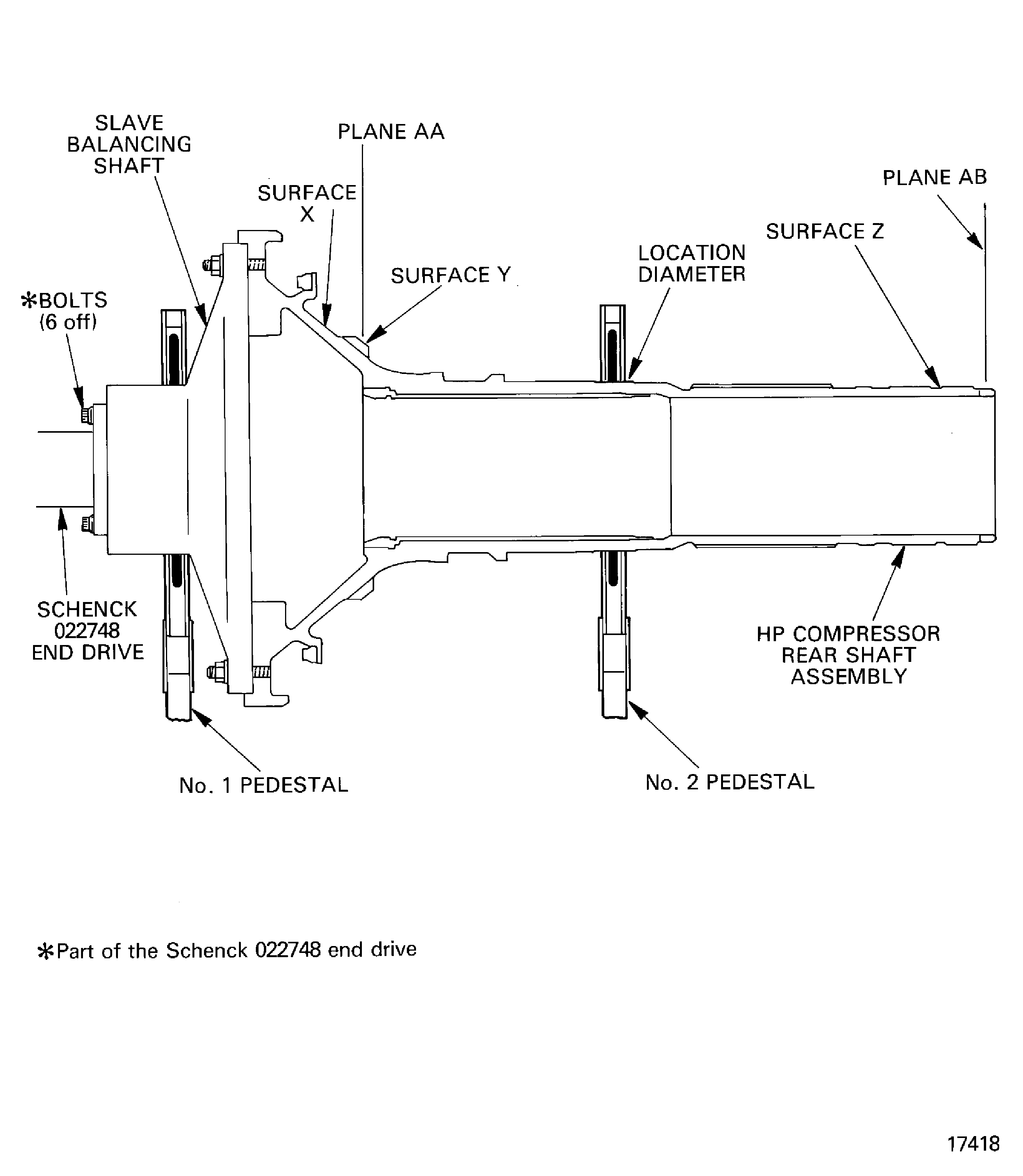 The 180 degree turn of the slave balancing shaft is necessary so that the tool unbalance can be calculated and removed.Install IAE 1R18649 Slae balancing shaft on to the HP compressor rear shaft assembly, 180 degrees from the original position.