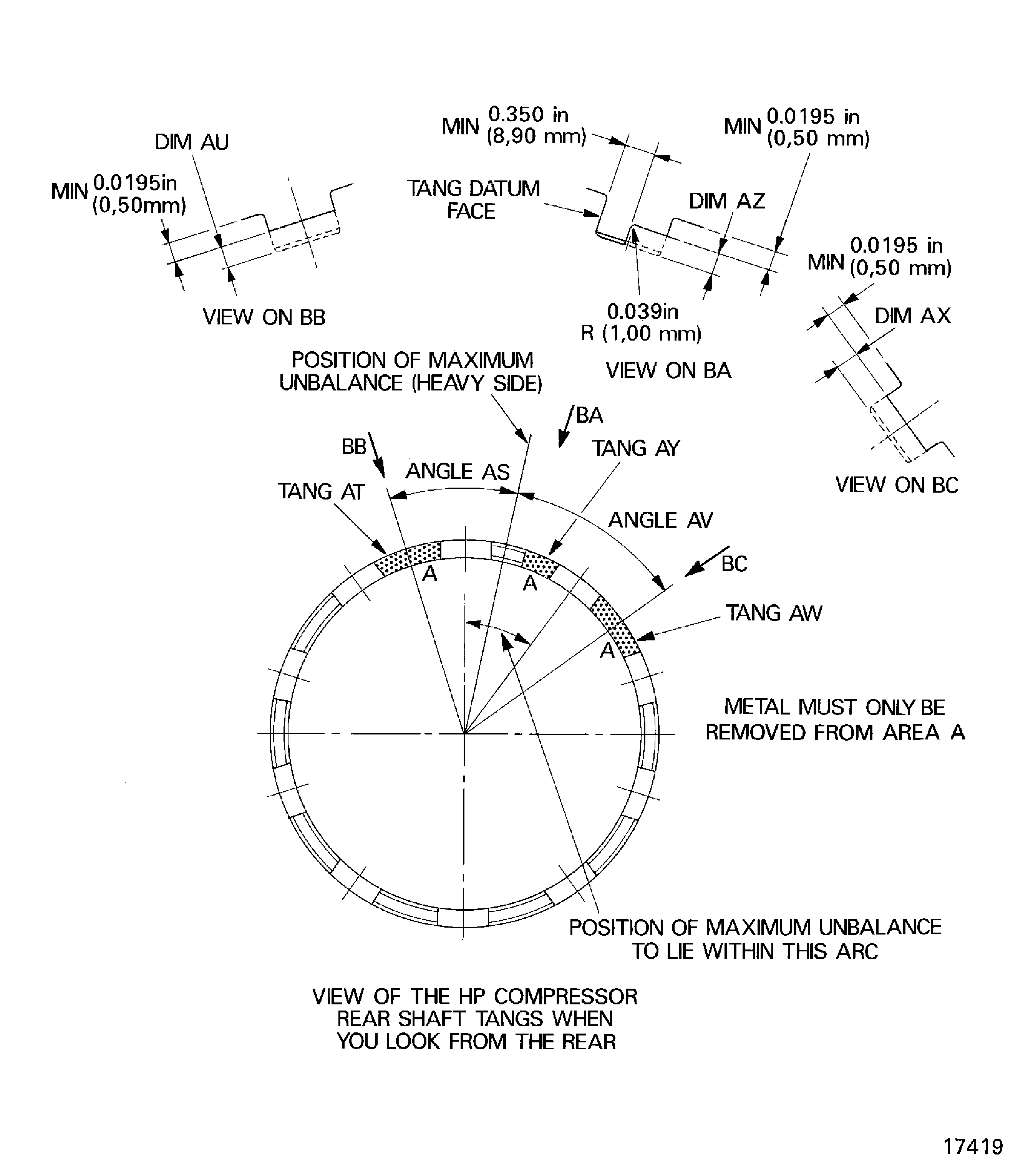 To find the quantity of metal to be removed for unbalance values of less than 0.42 ozin. (300 gmm) do step C.Find the position and quantity of metal to be removed from the HP compressor rear shaft tangs to correct the initial unbalance. Refer to Figure.
