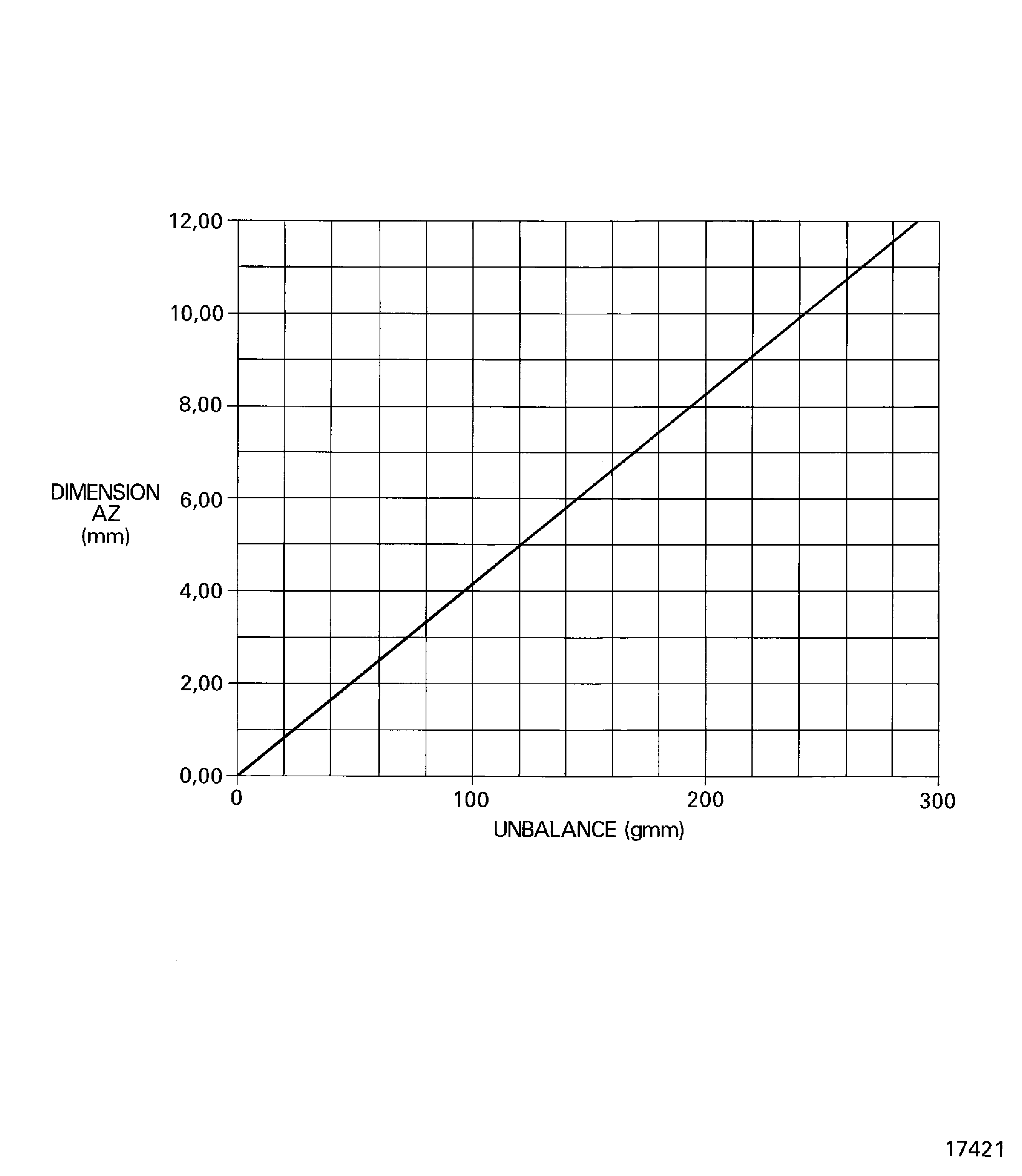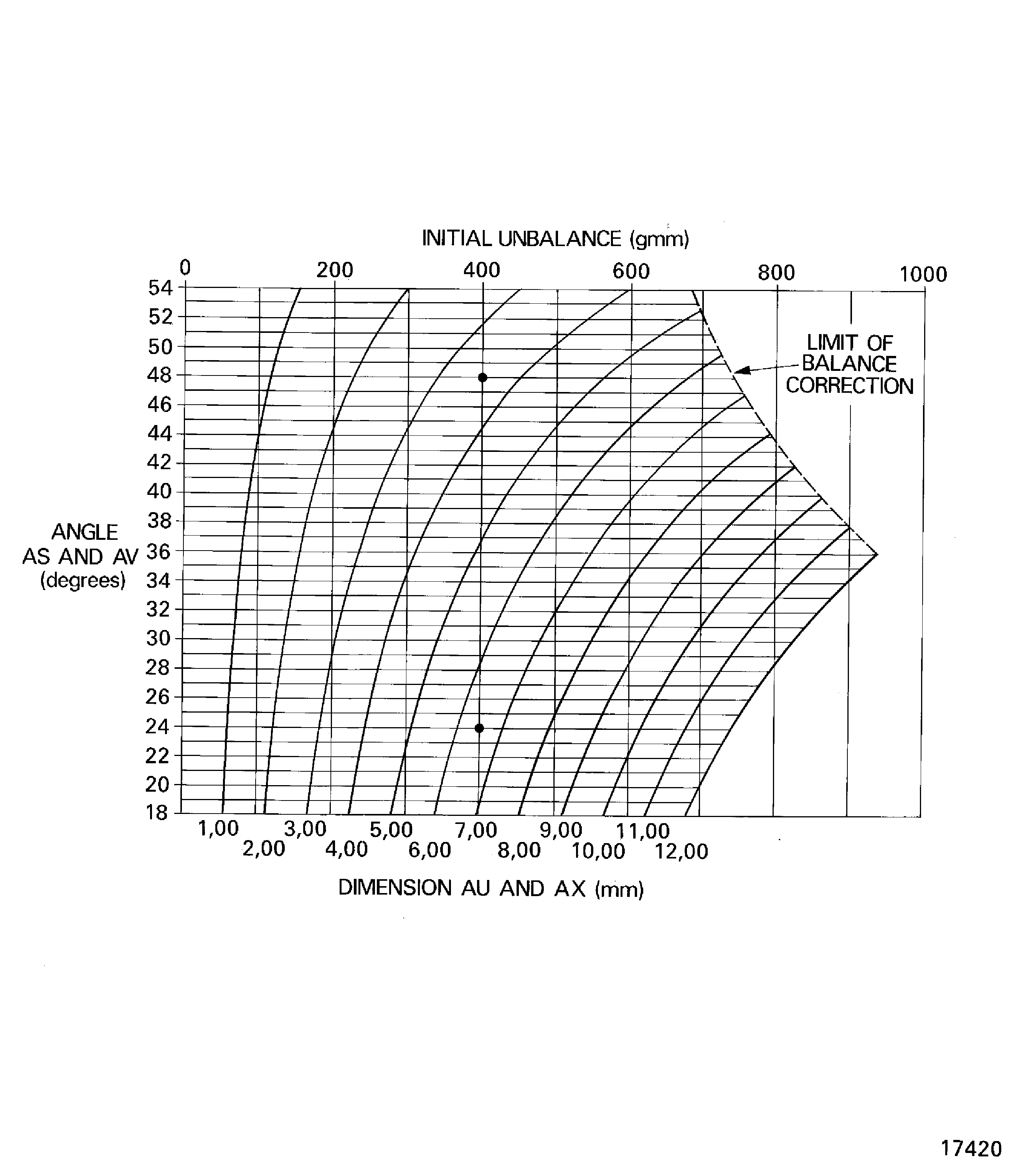 Dimension AU is found if you make an estimate of where the point of intersection of the initial unbalance line and angle AS line is, along a horizontal line drawn through this intersection point and between the curves either side of it. The horizontal distance between the curves represents 1.00 mm, therefore if the intersection point is estimated at a third of the way along the line, approximately 0.3 mm would be added to the dimension associated with the curve to the left.