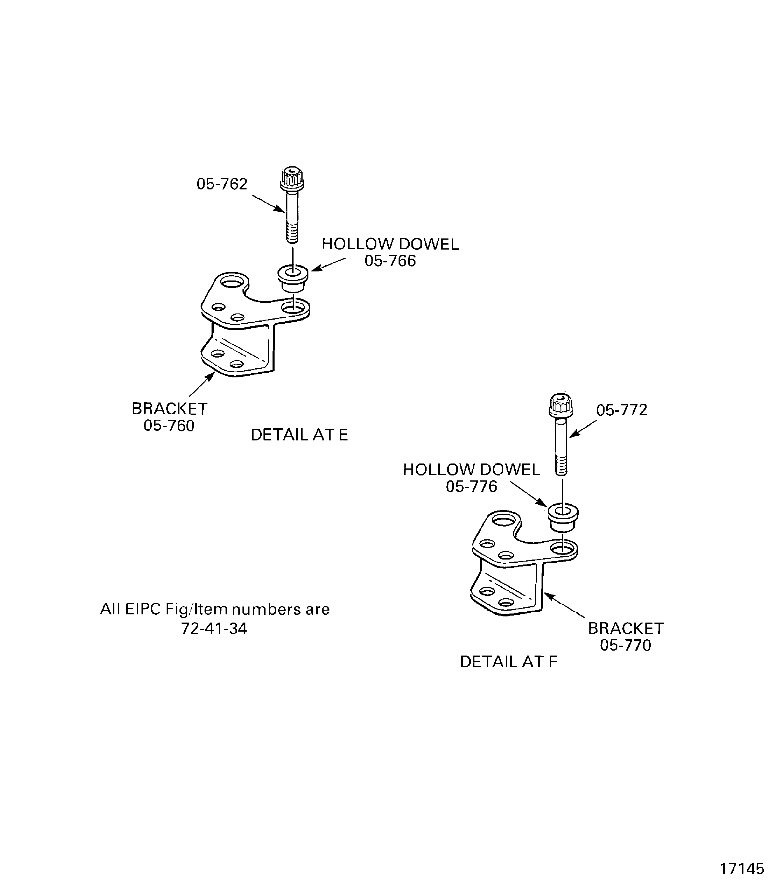 Install the two hollow dowels ACTUATING MECHANISM HP COMPRESSOR VARIABLE VANES (72-41-34, 05-766) and the two bolts ACTUATING MECHANISM HP COMPRESSOR VARIABLE VANES (72-41-34, 05-762) to attach the bracket to the lower stage 5 actuating ring.