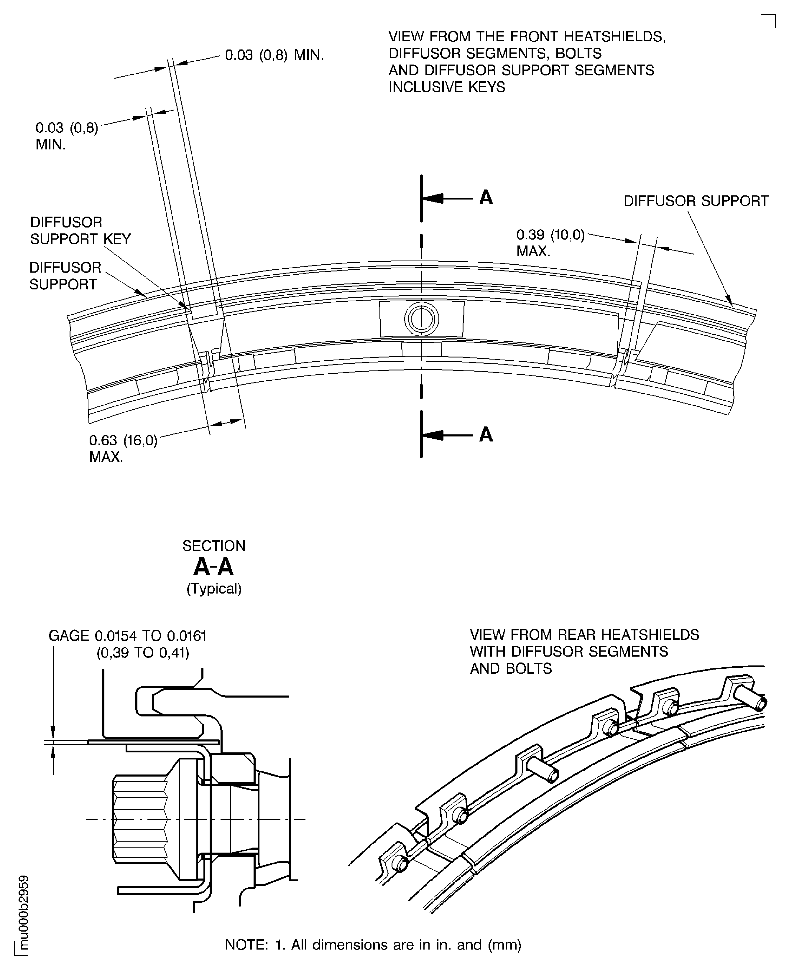 Install all 16 bolts which attach the assembly supports and the assembly segments. Align the heathields in accordance with the limits given in Figure. To obtain a gap of 0.0154 to 0.0161 in. (0.39 to 0.41 mm) use a suitable gage.
