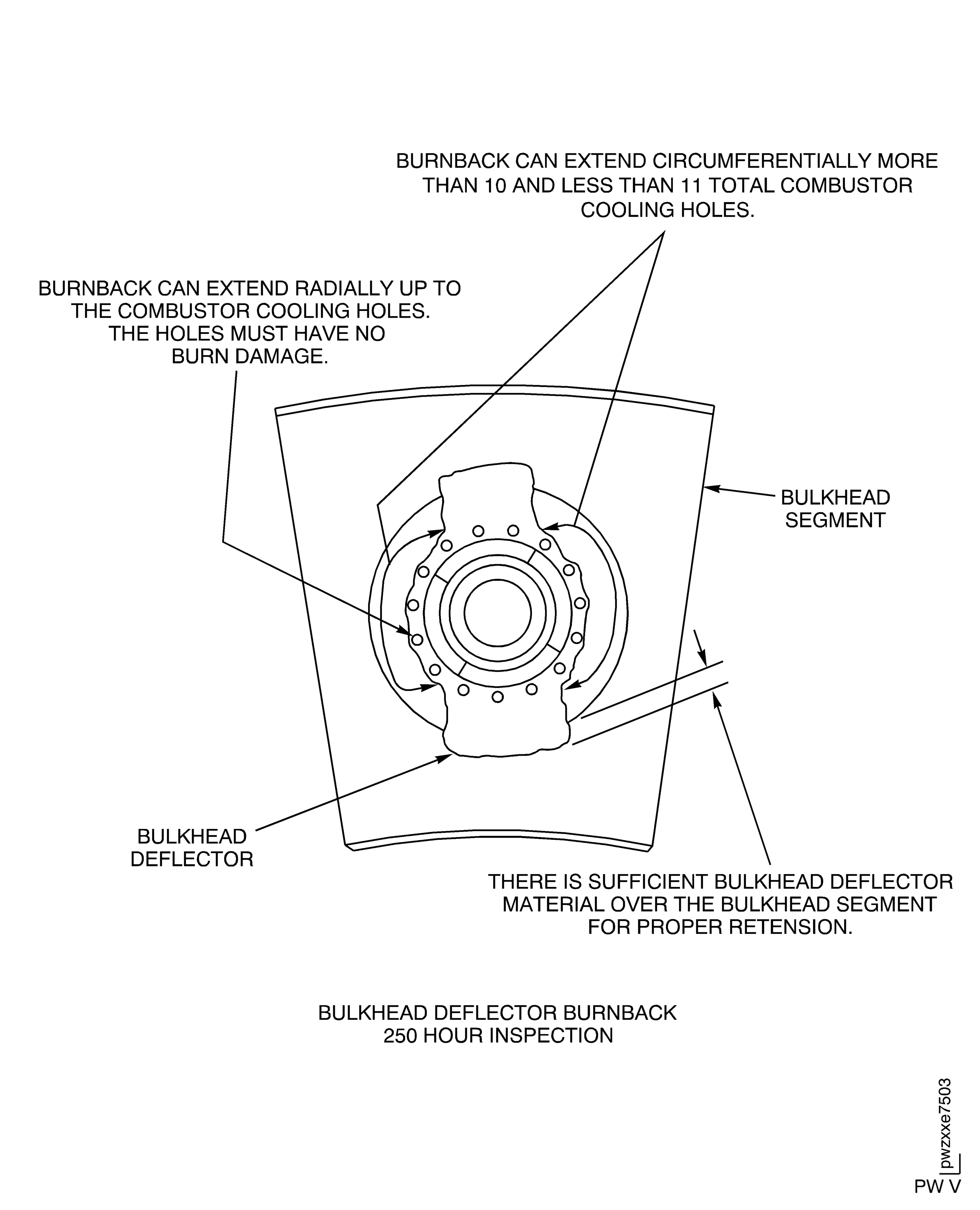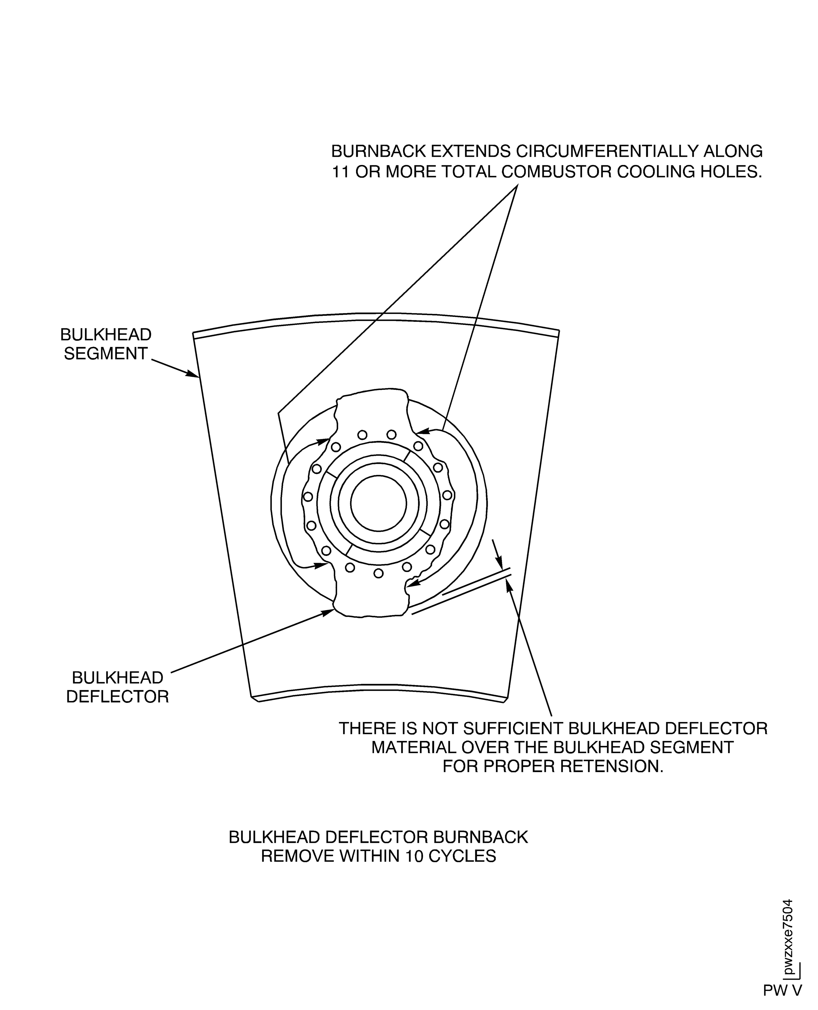 There are two or more cracks on the same side of one bulkhead segment. At least one crack extends from the edge of the bulkhead segment under the fuel nozzle guide or to the inner rim of the bulkhead segment, and another at least 0.375 in. (9.53 mm). These cracks are separated by more than 0.50 in. (12.70 mm).