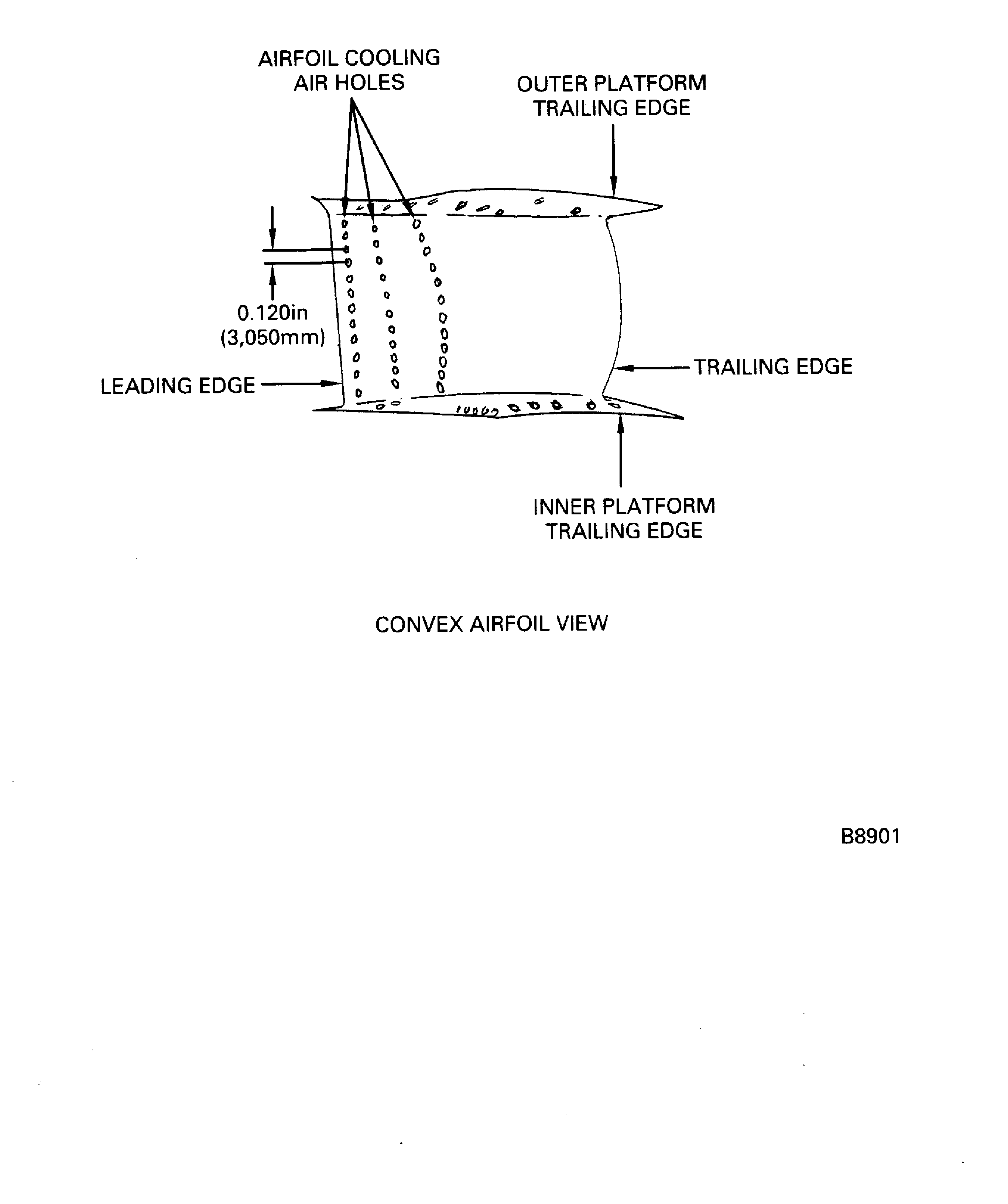 THE LIMITS THAT FOLLOW ARE APPLICABLE ON A CONTINUE-IN-SERVICE BASIS ONLY. EACH LIMIT IS BASED ON WHAT THE STRUCTURE OF THE VANE MUST BE AND DOES NOT INDICATE THAT THERE WILL NOT BE DETERIORATION OF THE ENGINE PERFORMANCE, STABILITY, OPERATING LIMITS OR PART REPAIRABILITY.Refer to Figure.