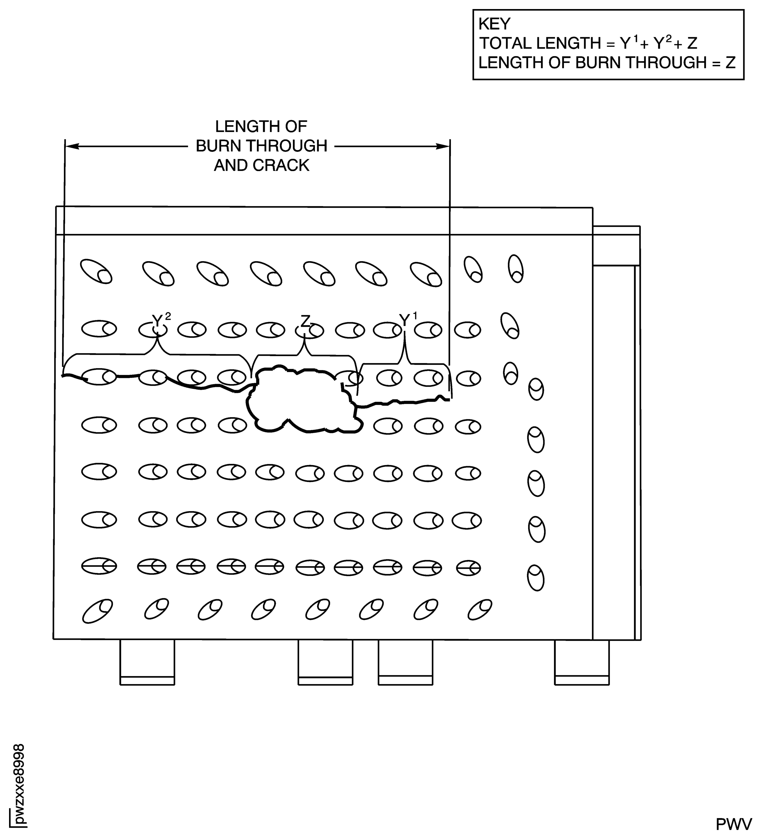 The crack on the leading edge (in the outer 50 percent span) extends from a burned area or burn-through and the combination of a burn or burn-through plus a crack is more than or equal to 0.20 in. (5.08 mm) in the radial direction and the crack is less than 0.45 in. (3.81 mm) in the radial direction.
