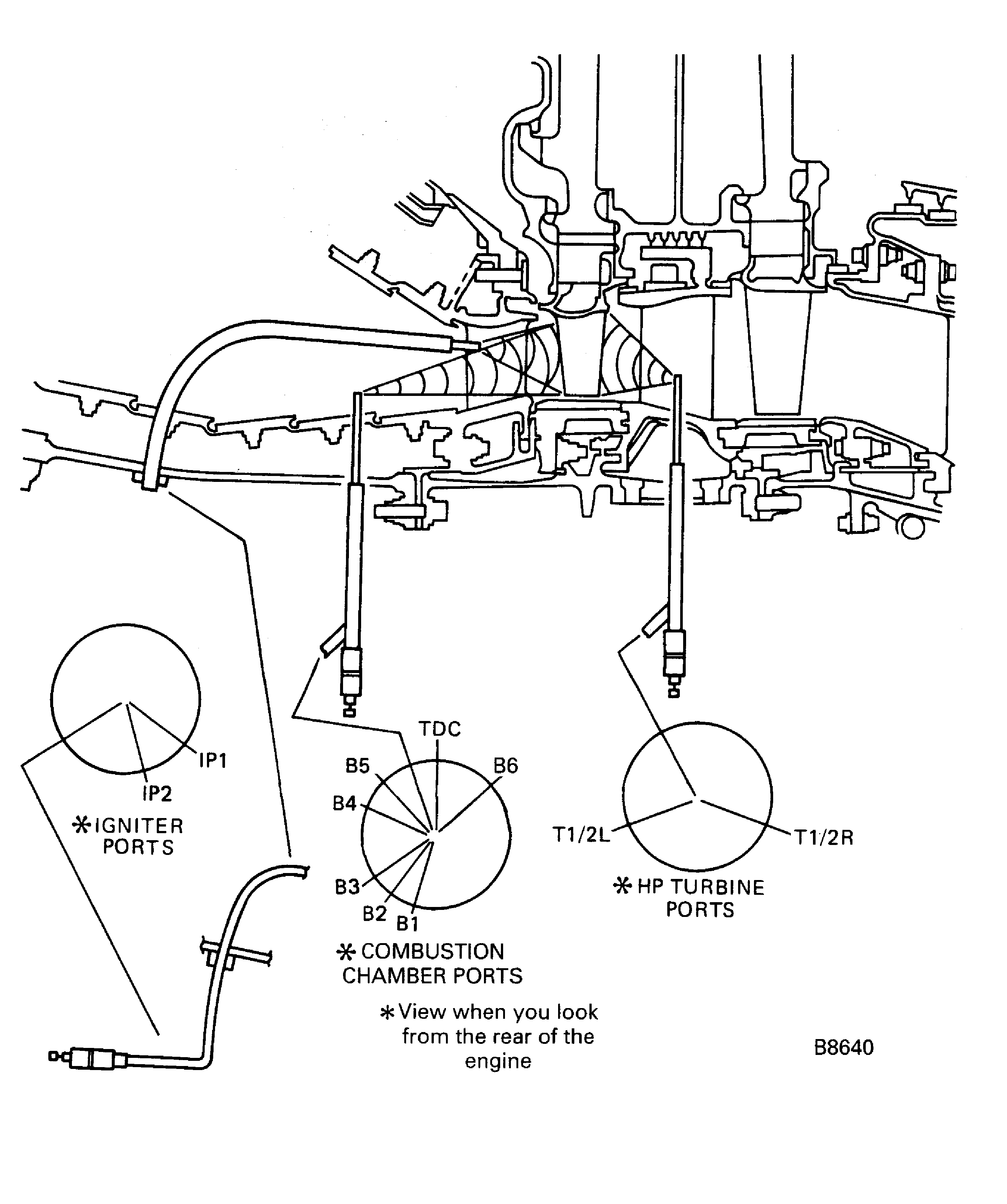 Put a rigid borescope through the B3 or B4 port, Figure.