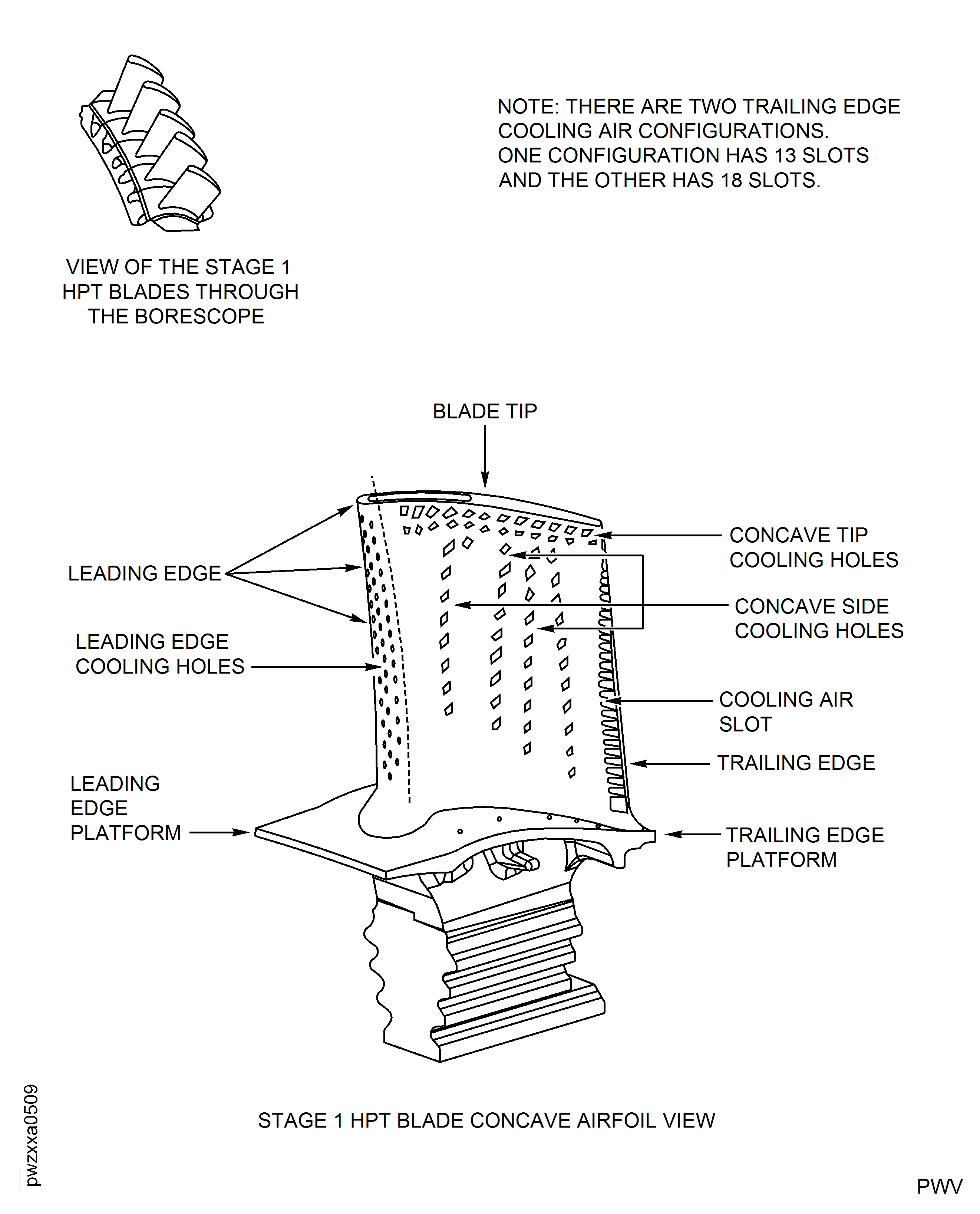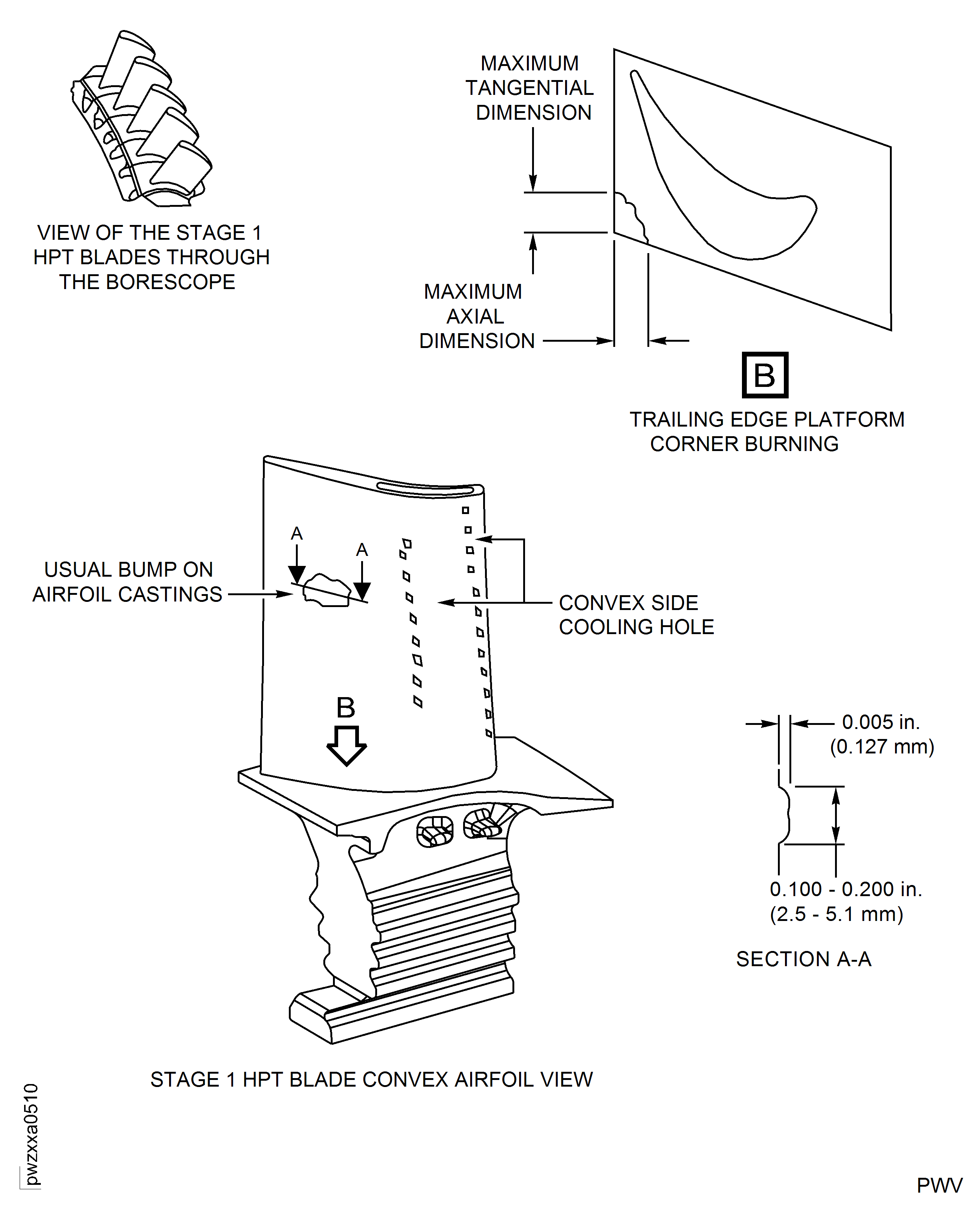 The newest standard of Stage 1 HPT blades has an outer ceramic coating and protective coatings underneath the ceramic coating. Erosion or chipping of the ceramic outer coating is acceptable. A reduced inspection interval or engine removal is not necessary until burning or erosion of the base material of the blade occurs as specified below. Thus, it is not necessary to remove the engine or reduce the inspection interval because of coating loss.The leading edge hole beyond the 75 percent span is less than 0.10 in. (2.54 mm) axially and 0.15 in. (3.81 mm) radially.