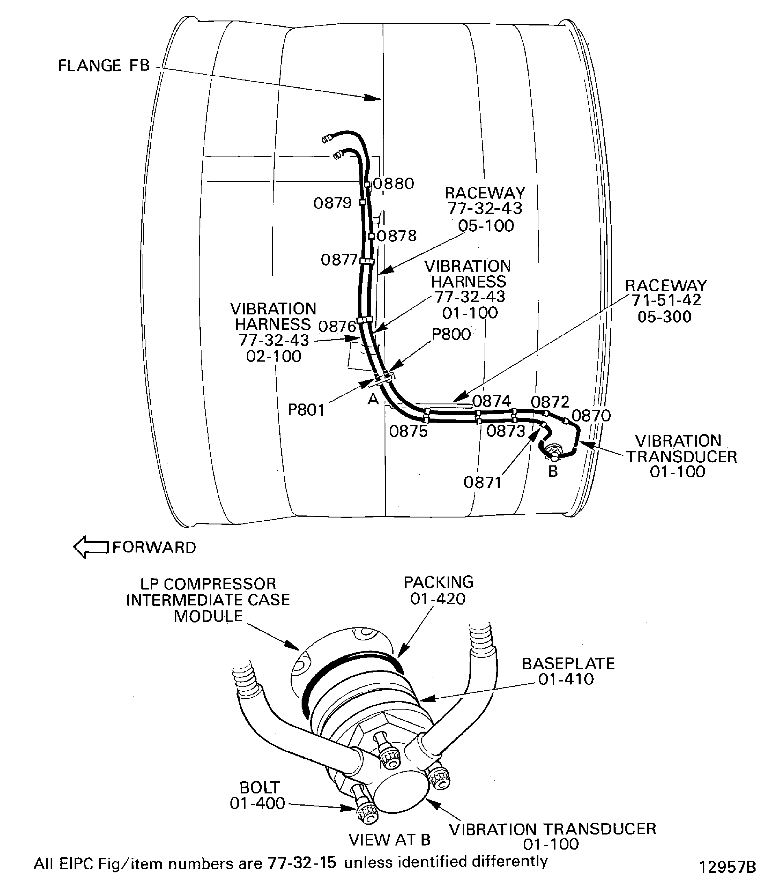 The three bolts hold the transducer and the baseplate Vibration Transducer(77-32-15,01-410) together as a loose assembly.Loosen the three bolts Vibration Transducer (77-32-15, 01-400) which attach the transducer to the LP compressor/intermediate case.