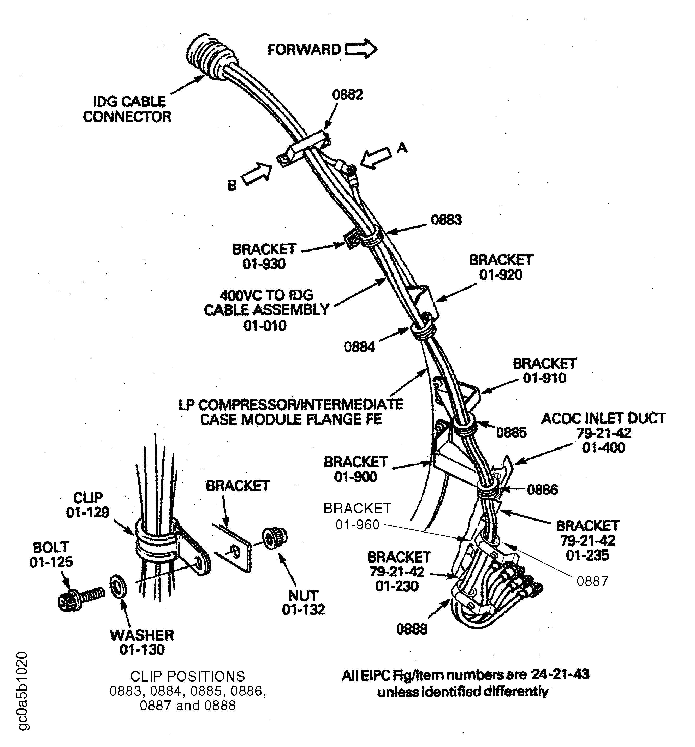 Install the clamp ELECTRICAL POWER-IDG CABLES (24-21-43,01-030) on the cables. Attach the clamp to the brackets ELECTRICAL POWER-IDG CABLES (24-21-43,01-950) and ELECTRICAL POWER-IDG CABLES (24-21-43,01-952) with the two bolts and the two nuts ELECTRICAL POWER-IDG CABLES (24-21-43,01-020) and ELECTRICAL POWER-IDG CABLES (24-21-43,01-040) at the clip position 0882.