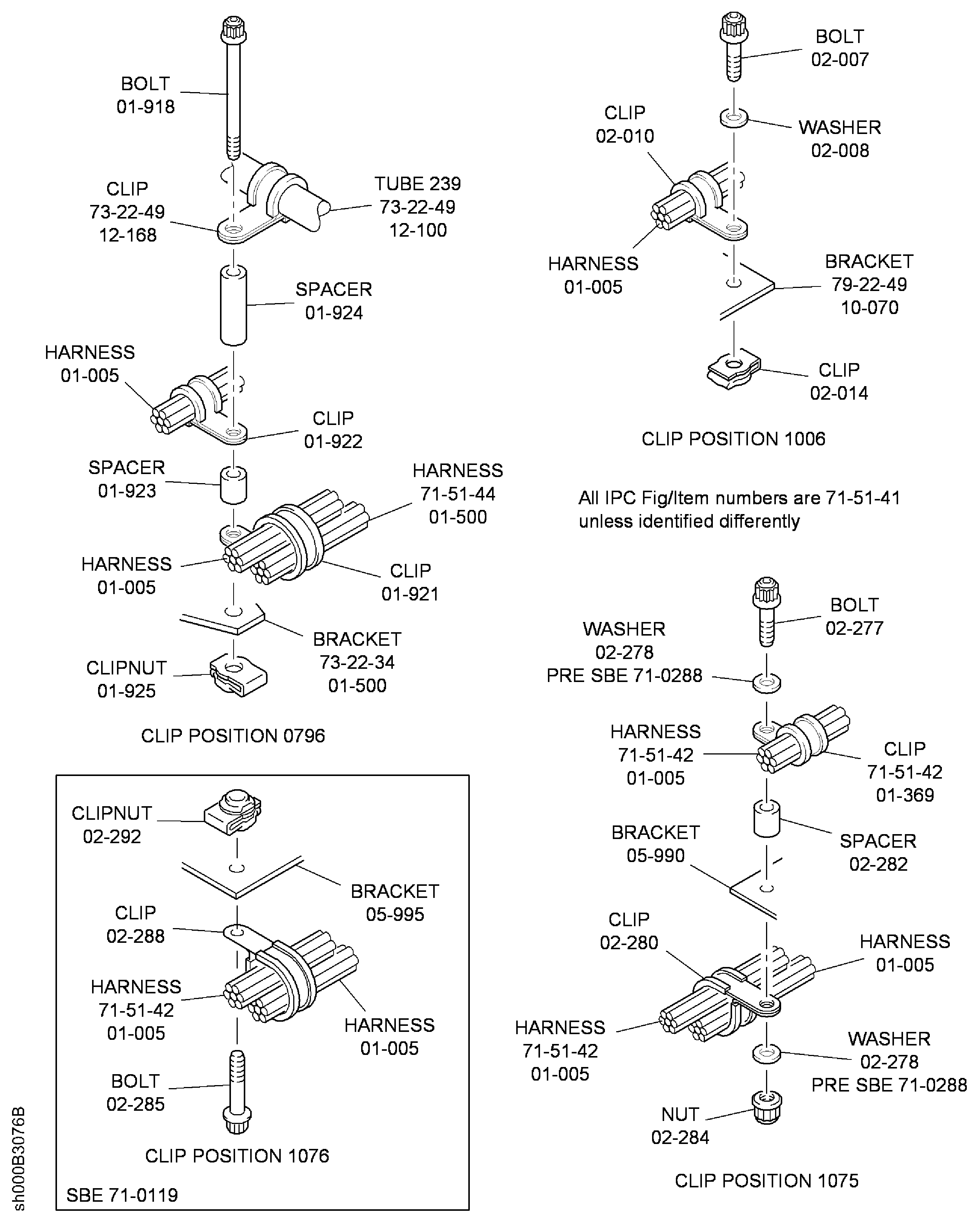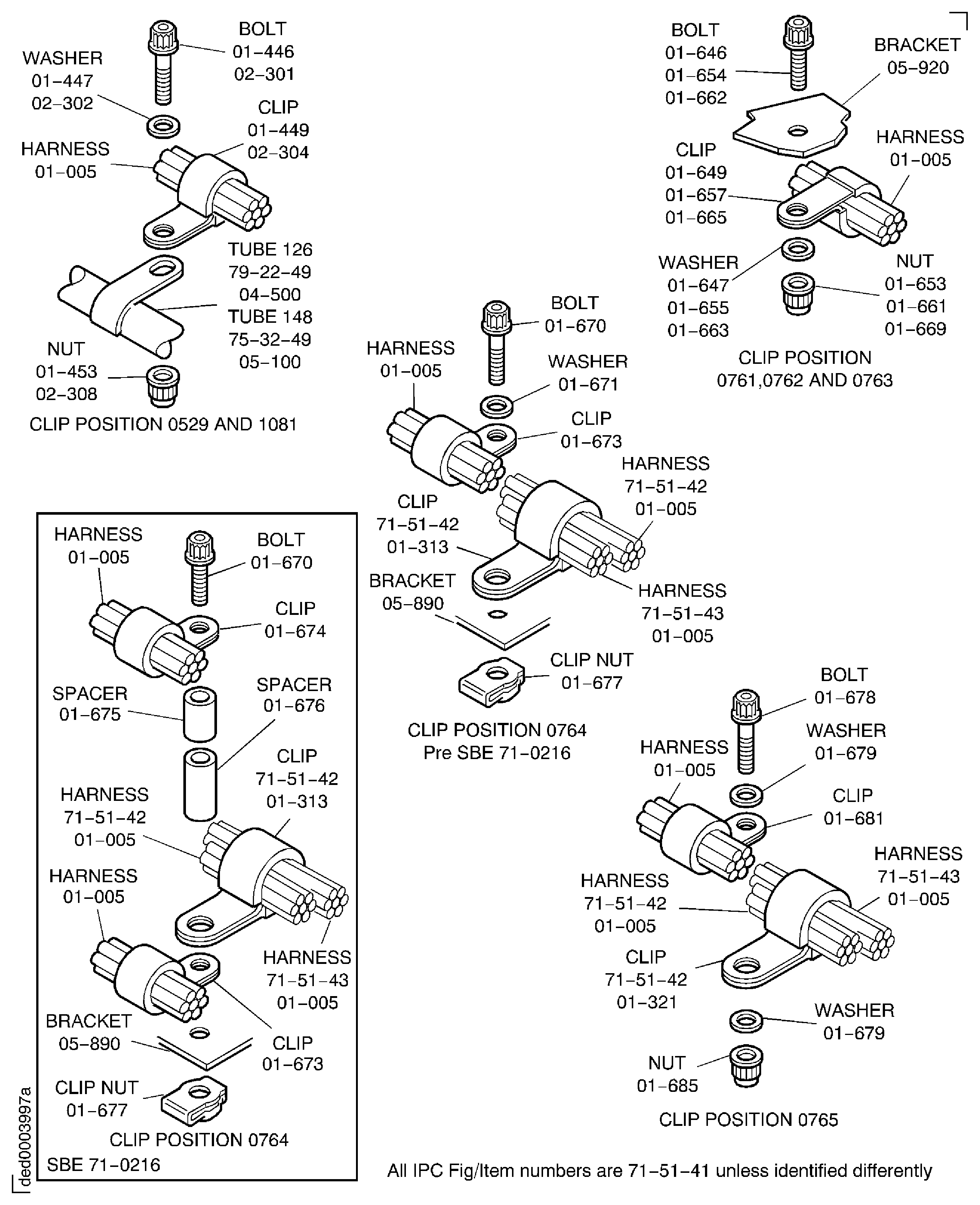 Temporarily attach the harnesses to the applicable bracket at the datum clip positions 1075, 0781 and 0764 with CoMat 06-086 TIES. Also datum clip position 0550 to the tube lug, Figure.